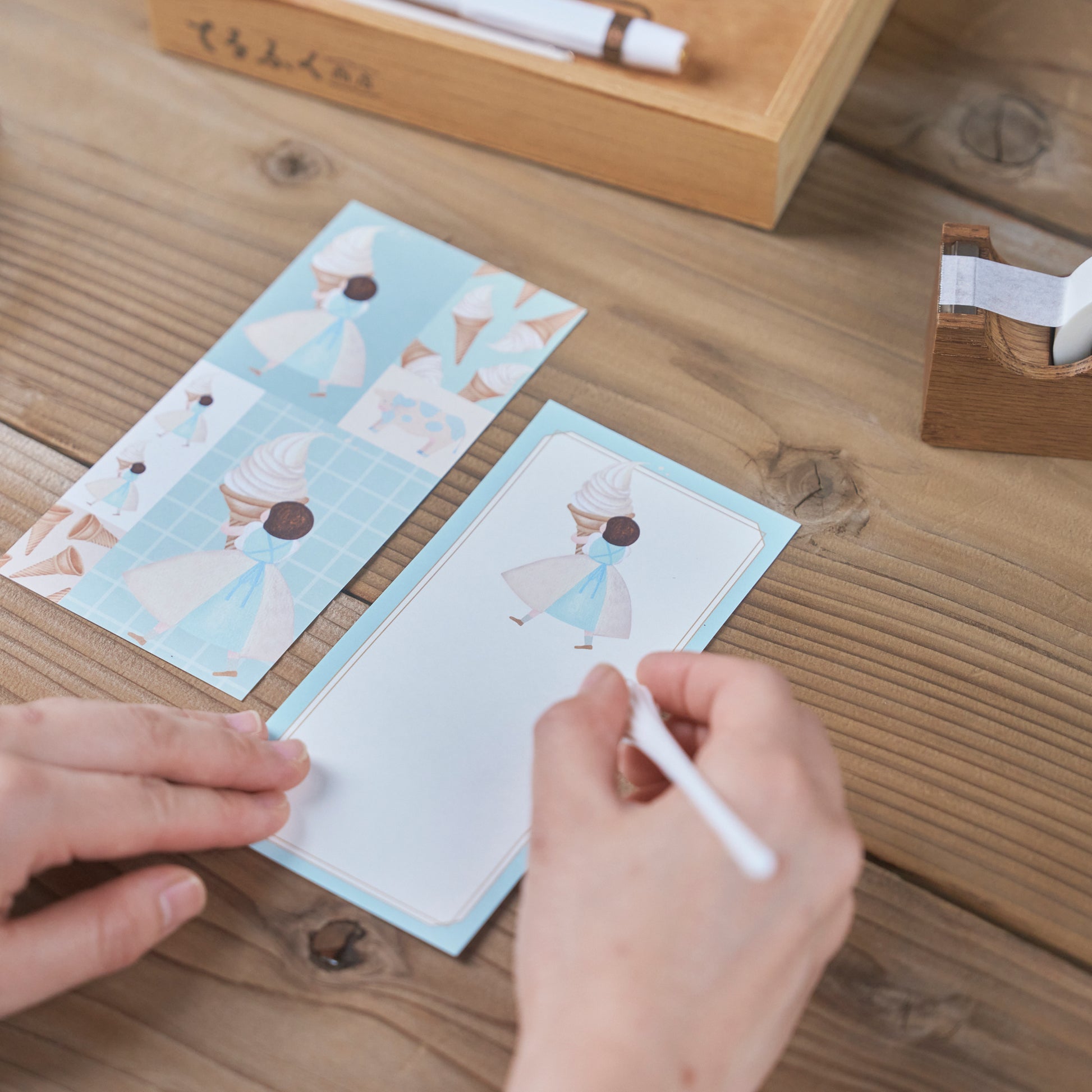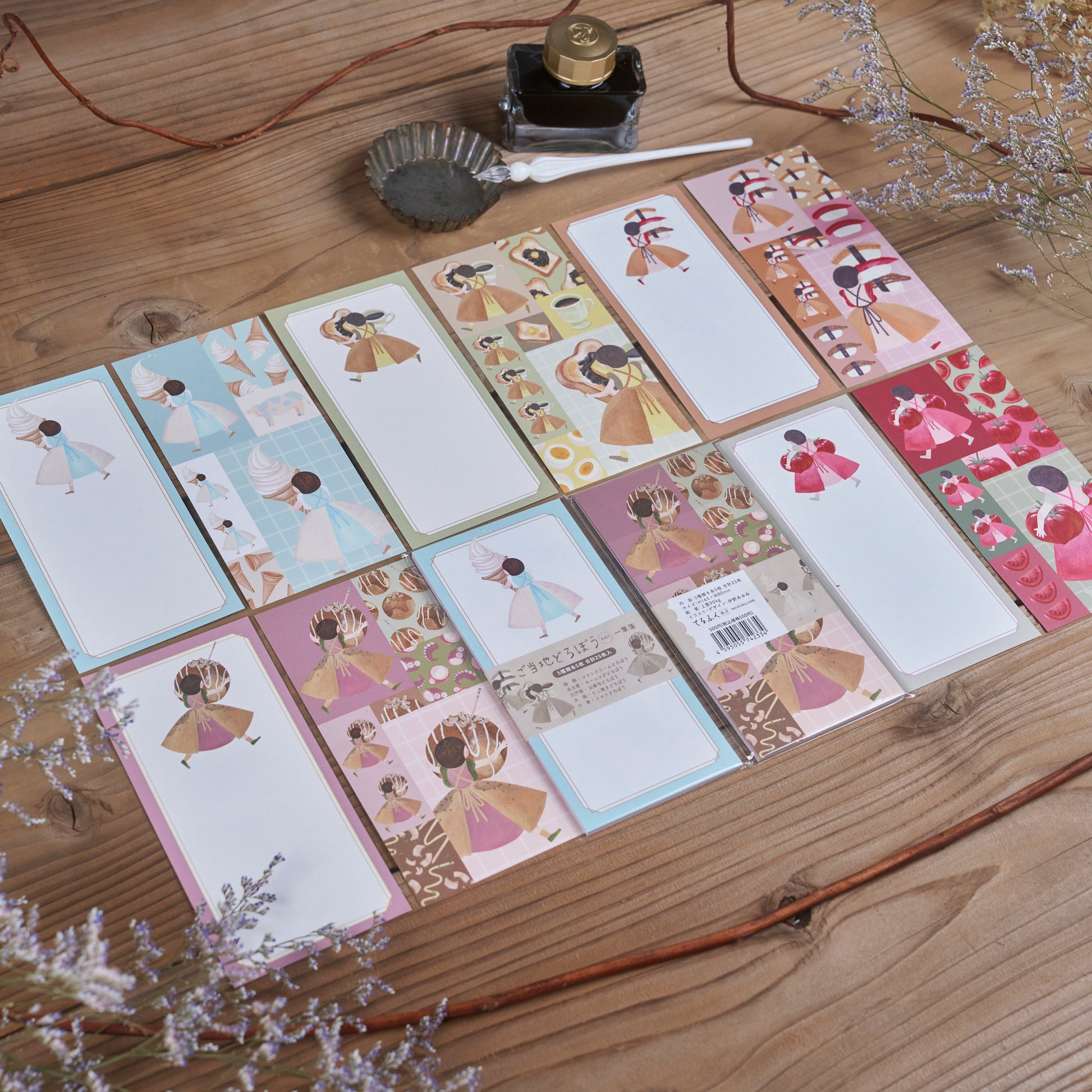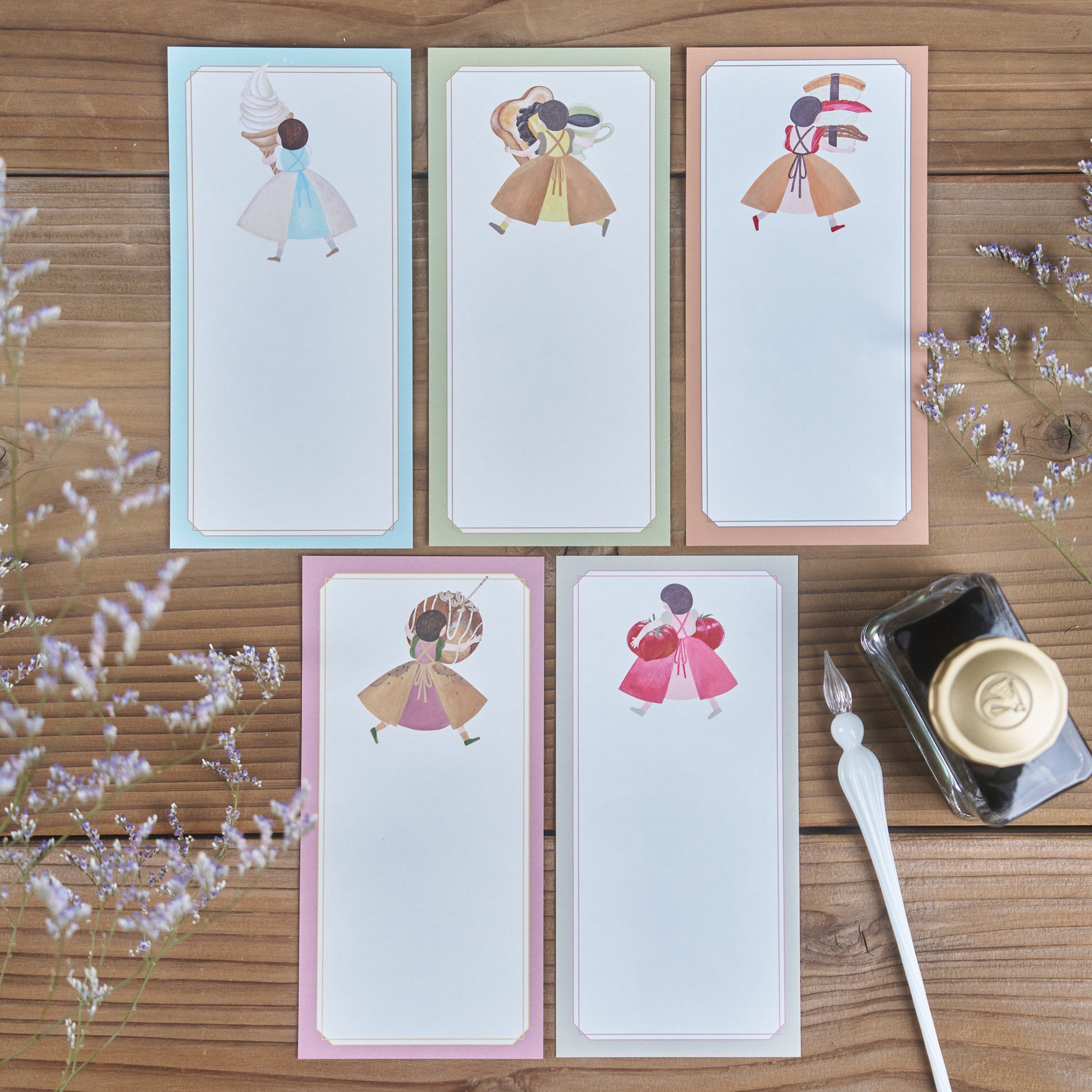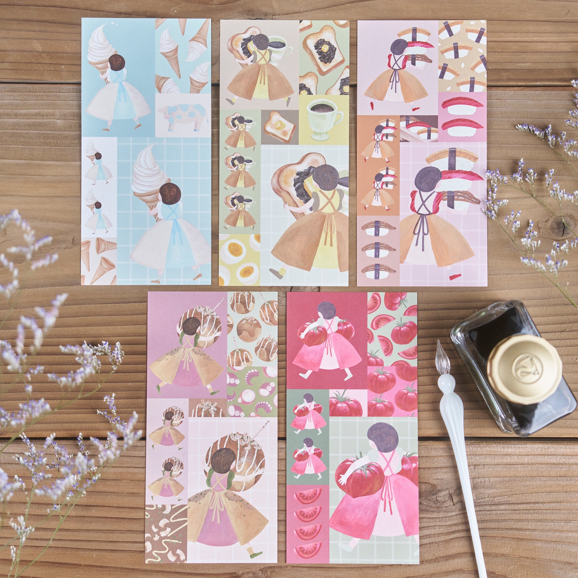 函館の「ソフトクリーム」、名古屋の「モーニング」、江戸前「お寿司」、大阪の「たこ焼き」小倉の「トマト」を持っていく女の子たちの一筆箋です。
