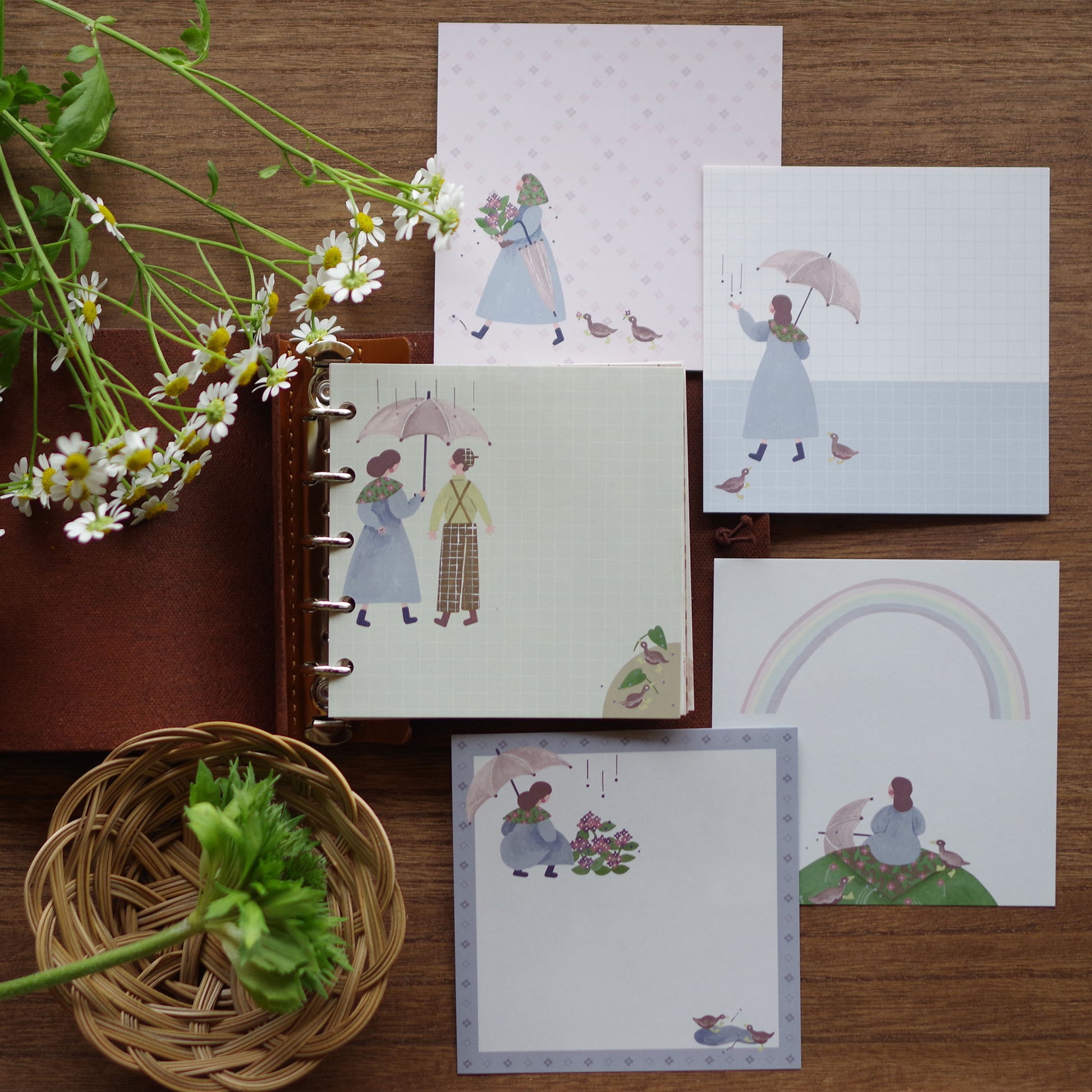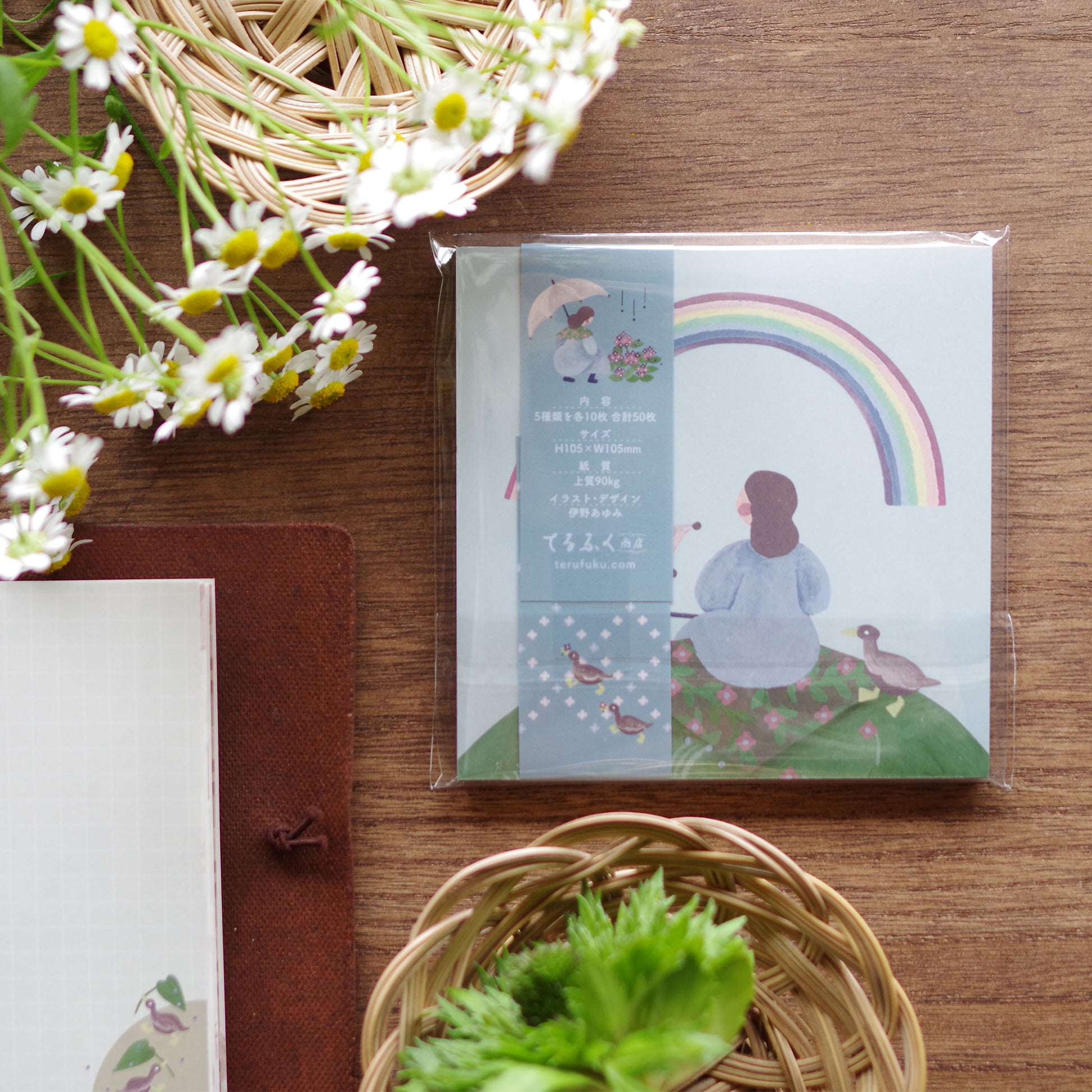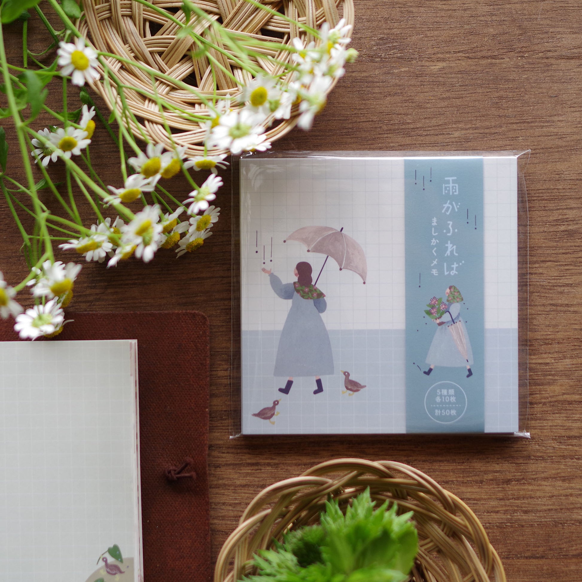 5種類のメモ用紙が10枚ずつ入った、50枚入りの正方形のメモ帳です。