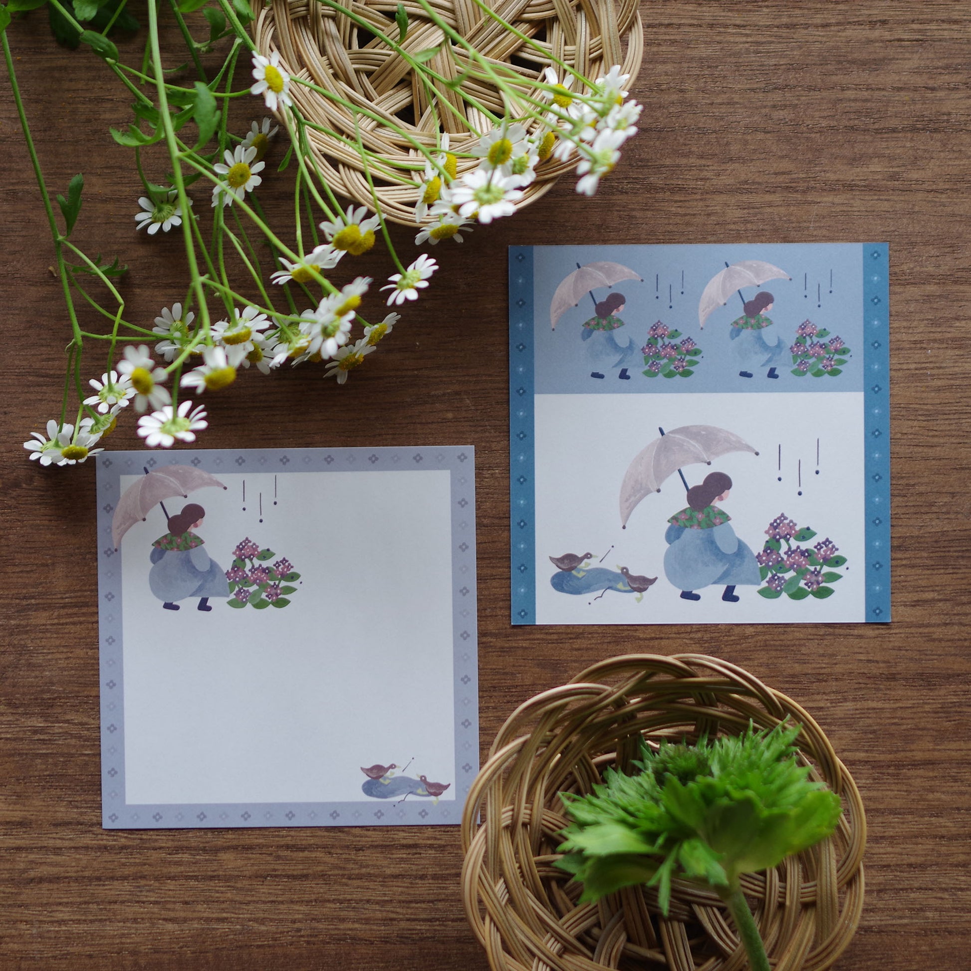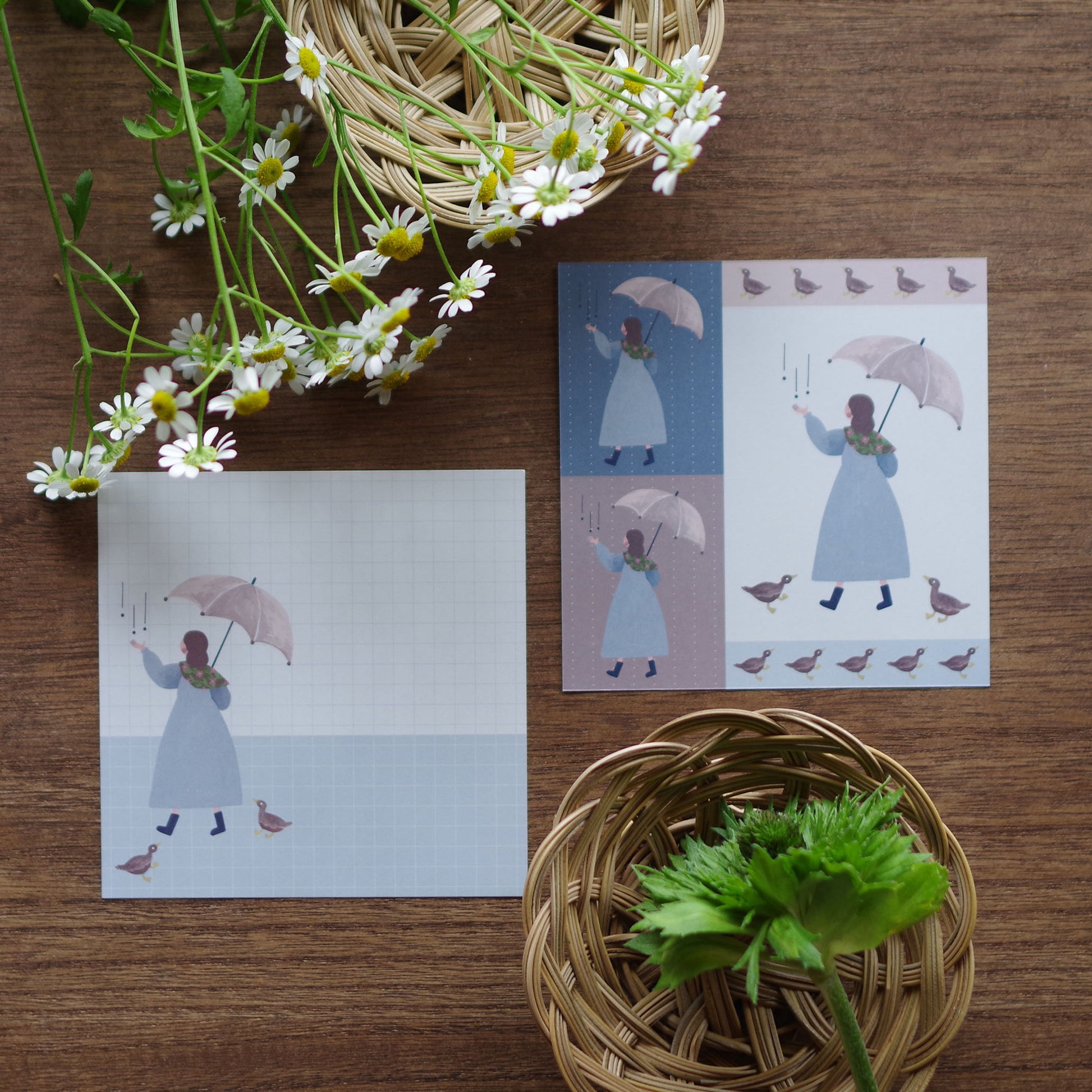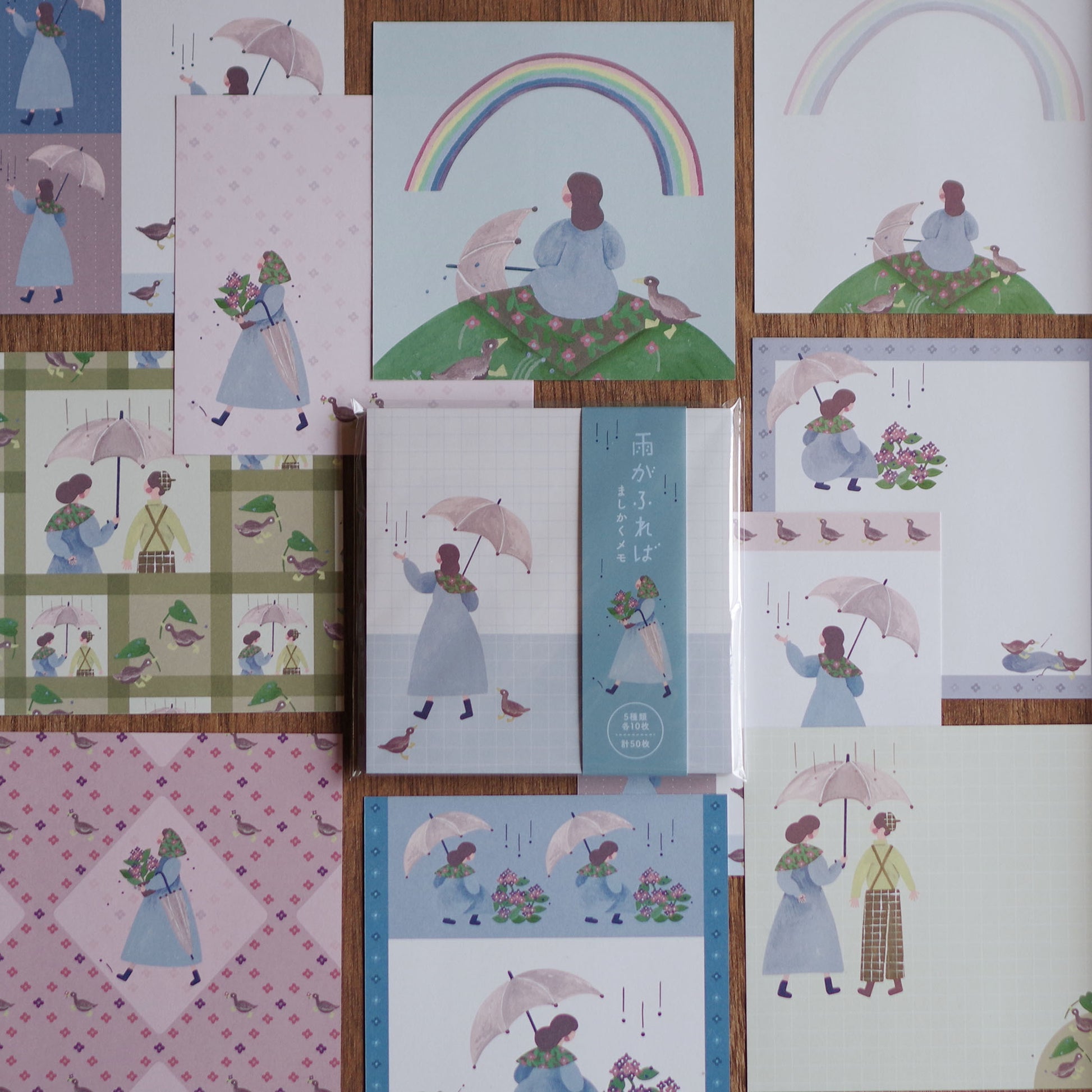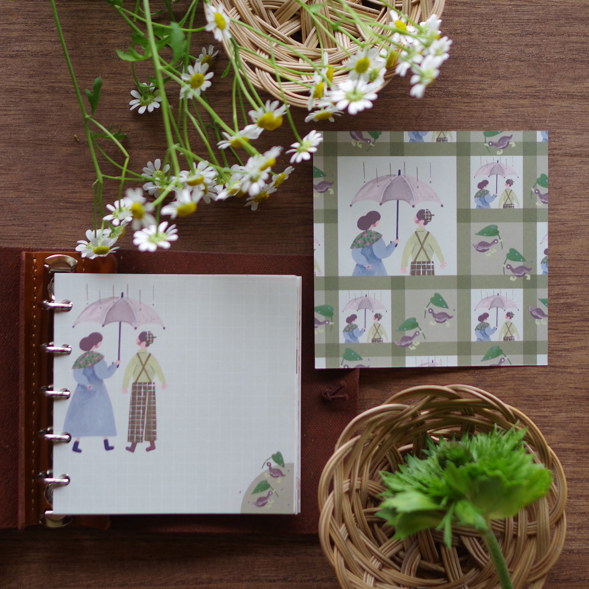 5種類のメモ用紙が10枚ずつ入った、50枚入りの正方形のメモ帳です。