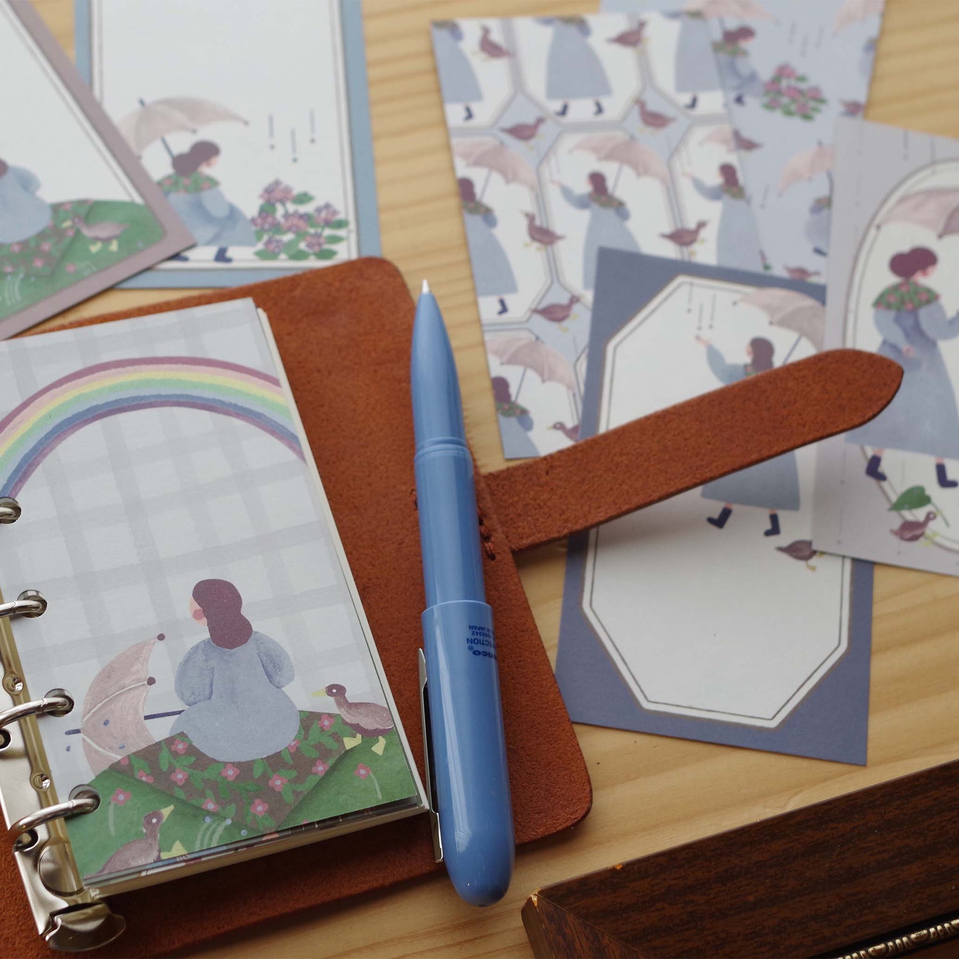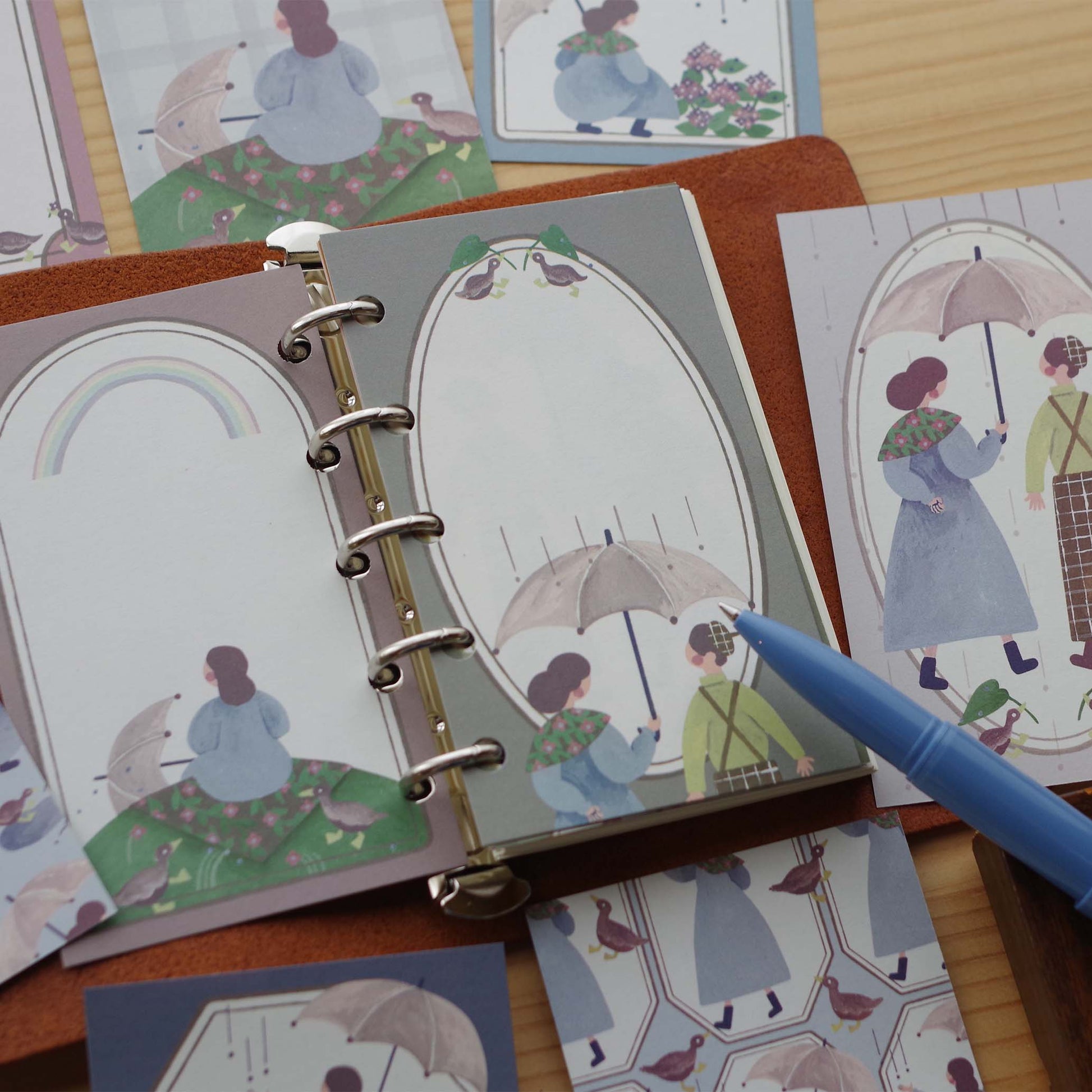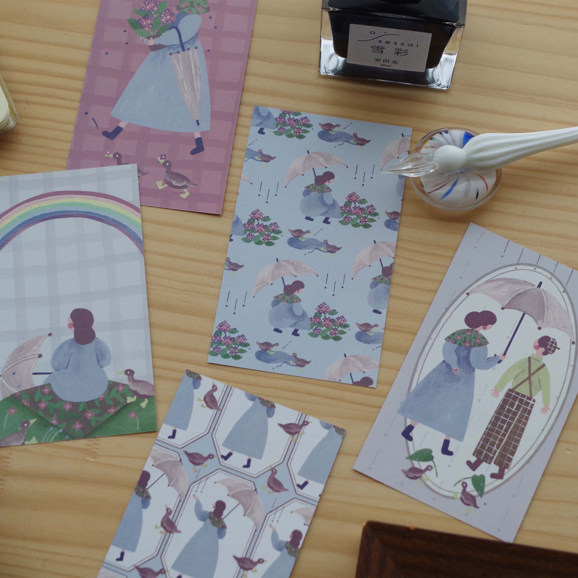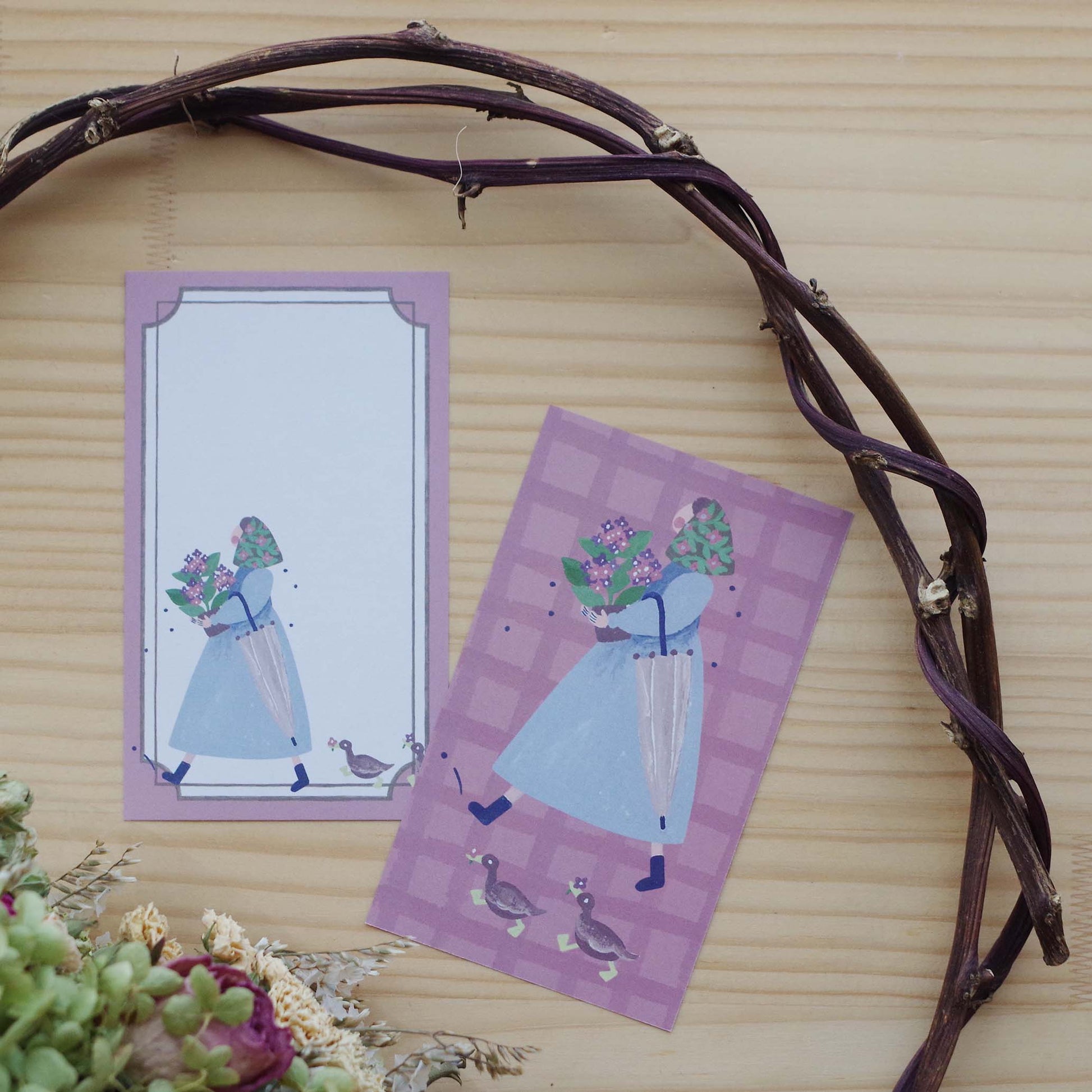雨の日を楽しむ女の子のちいさなメモ紙です。