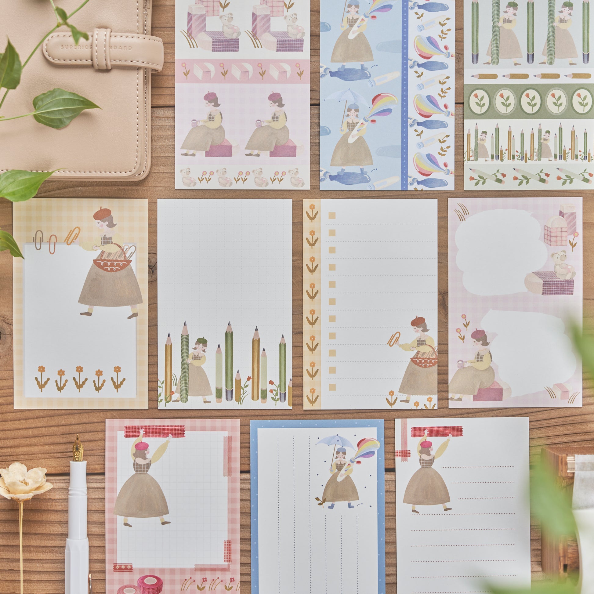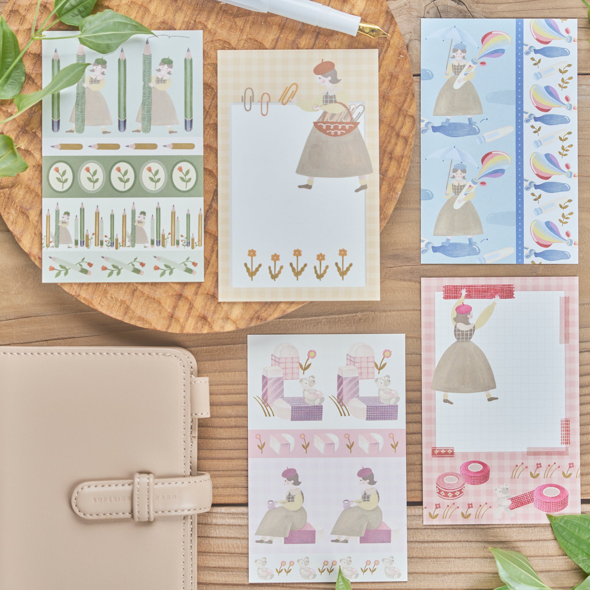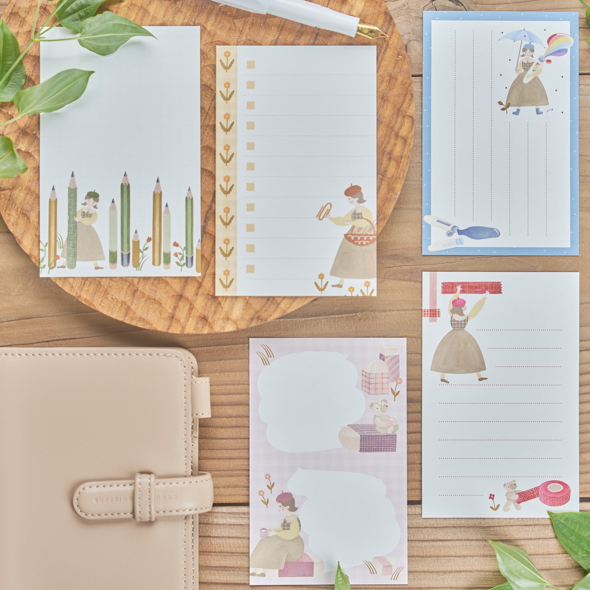 方眼メモ、チェックリスト、吹き出しメモ、横書きメモ、縦書きメモ、5種類の用途のメモ紙を詰め合わせました。