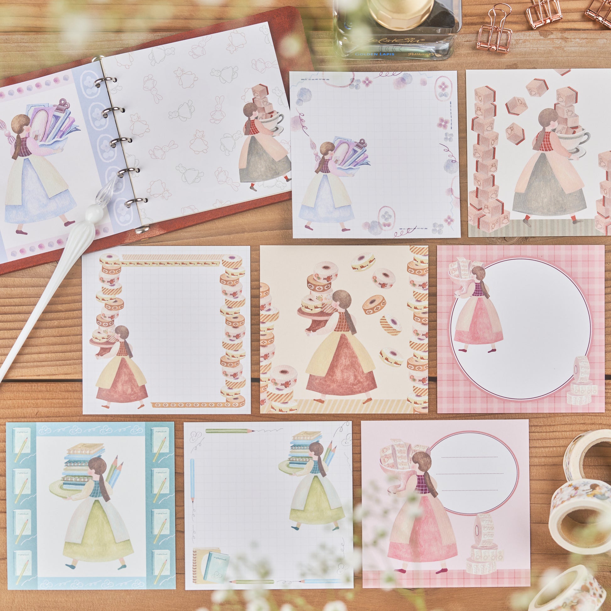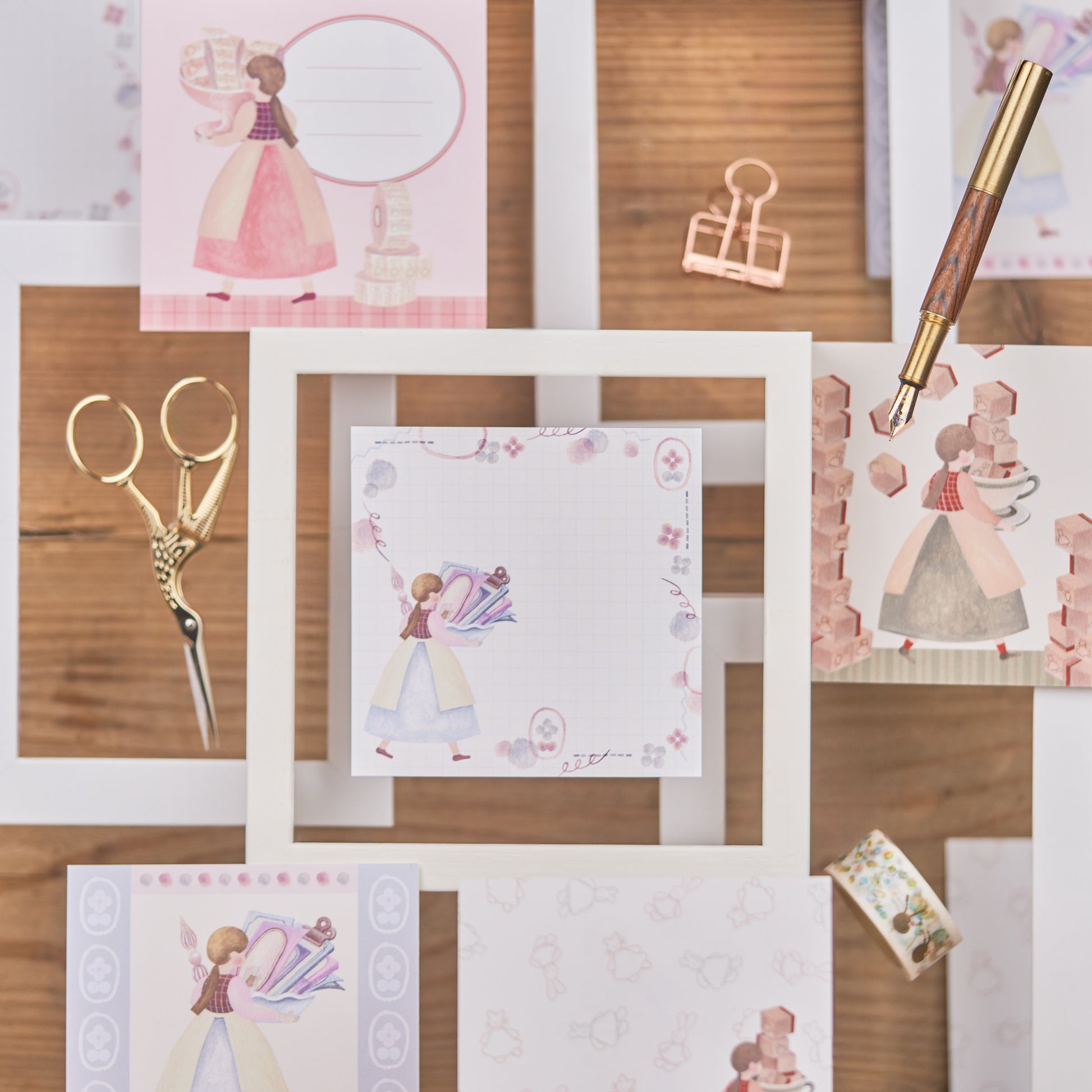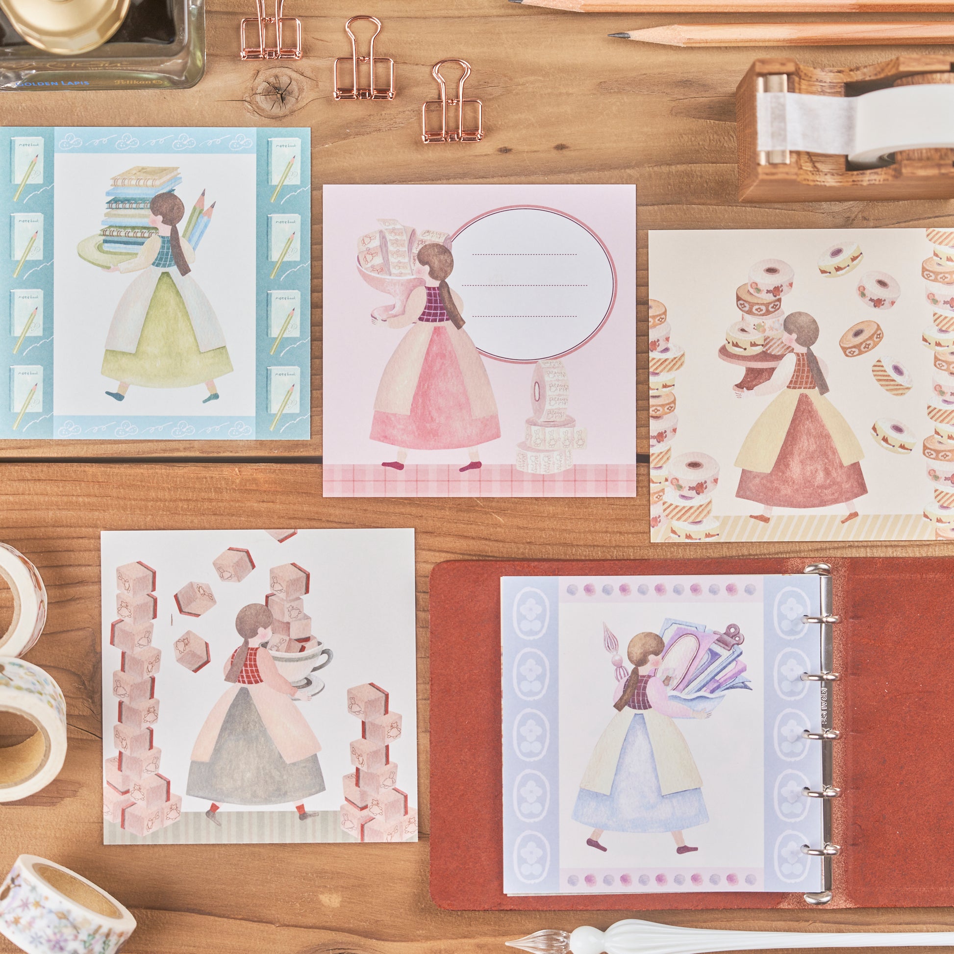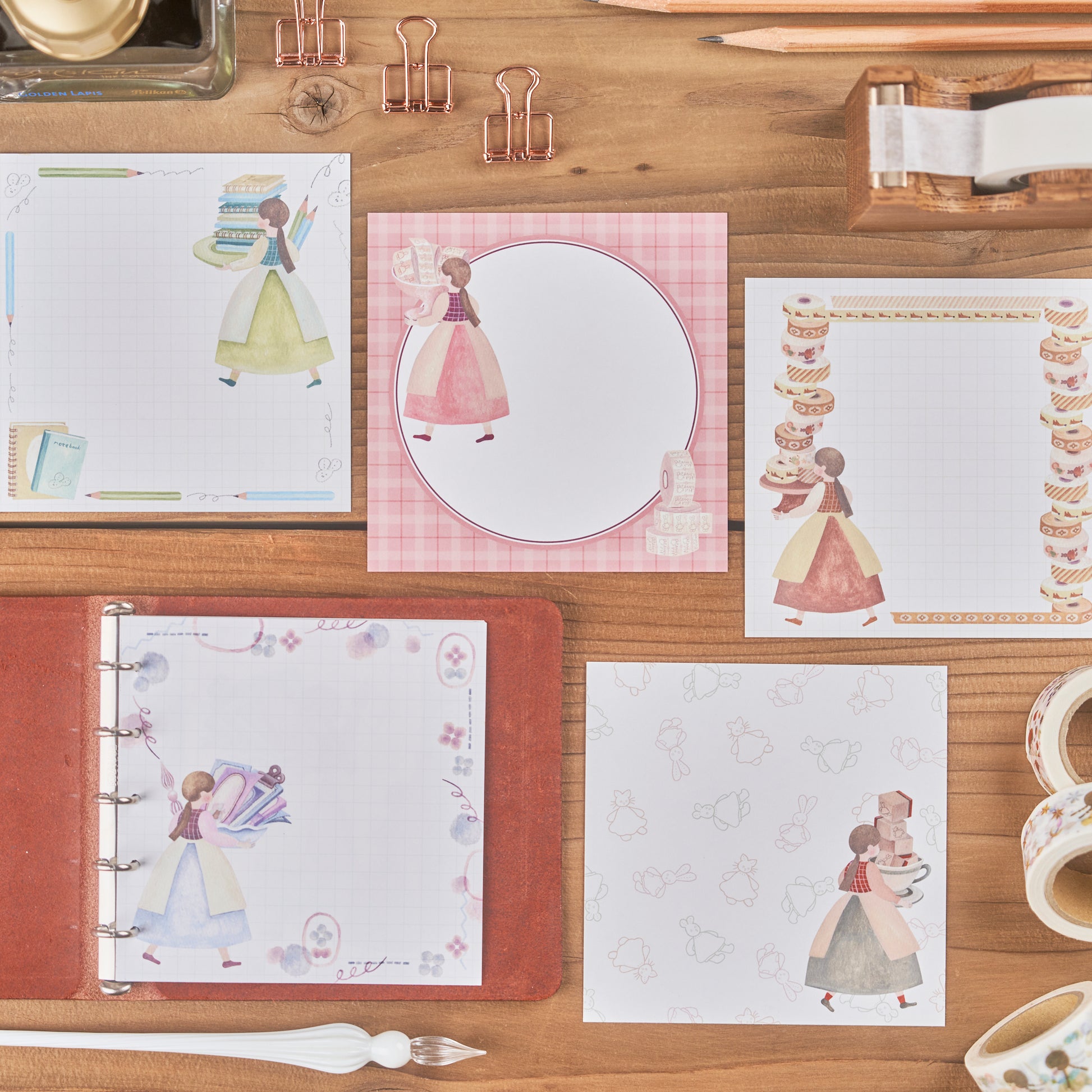 5種類のメモ用紙が10枚ずつ入った、50枚入りの正方形のメモ帳です。