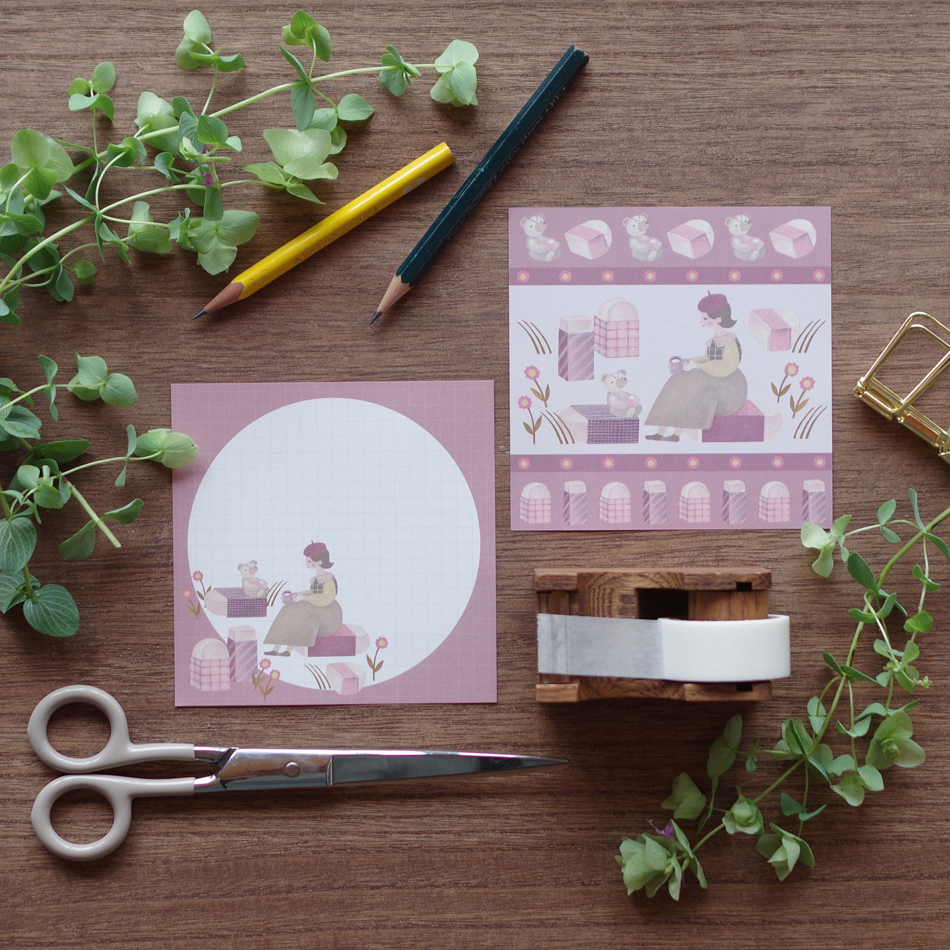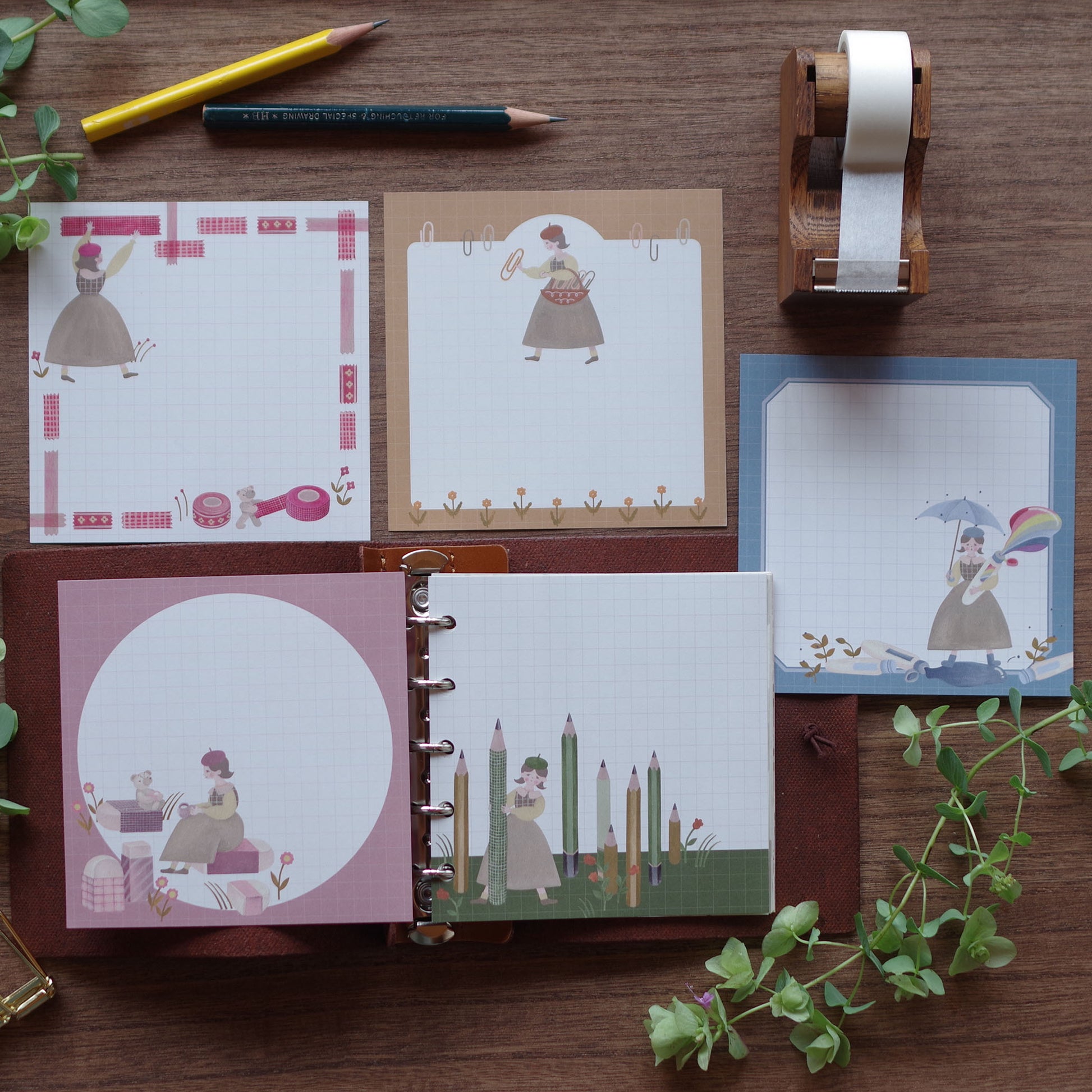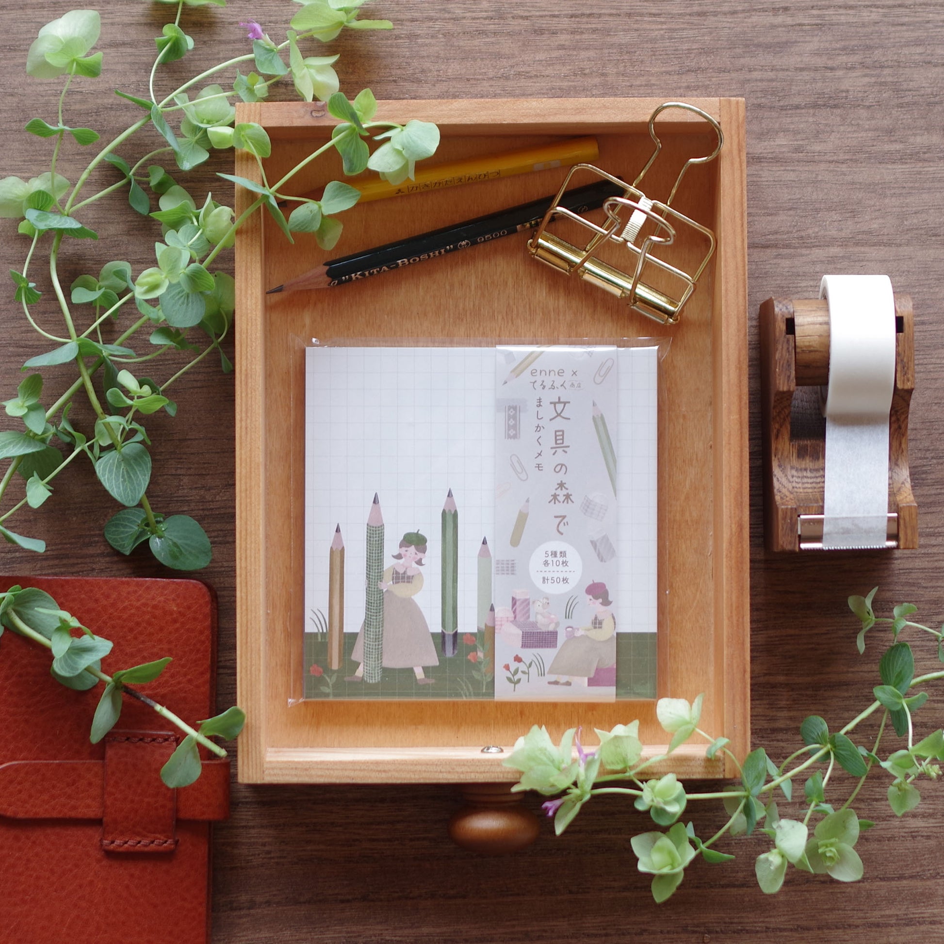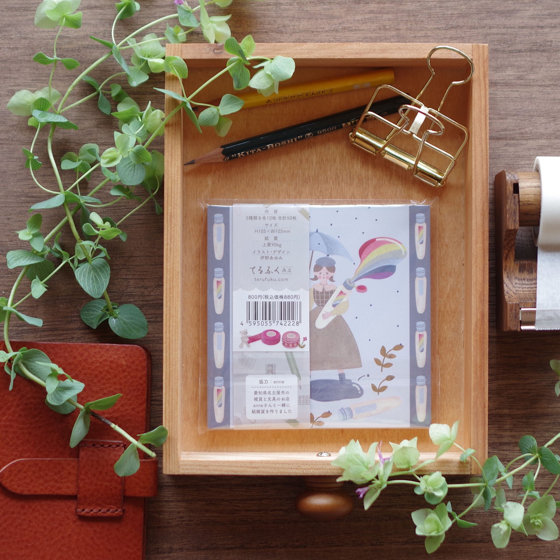 5種類のメモ用紙が10枚ずつ入った、50枚入りの正方形のメモ帳です。
