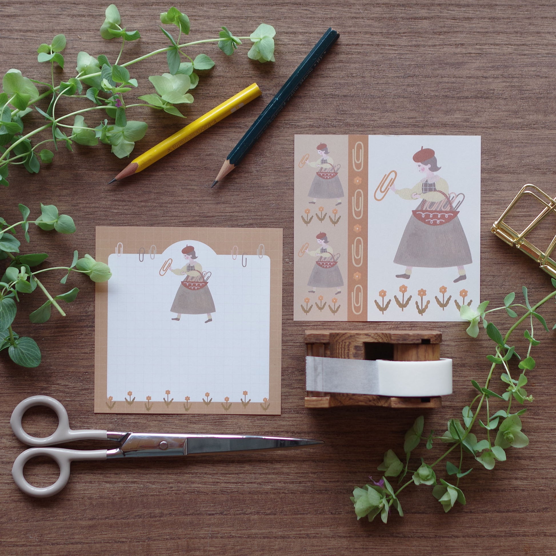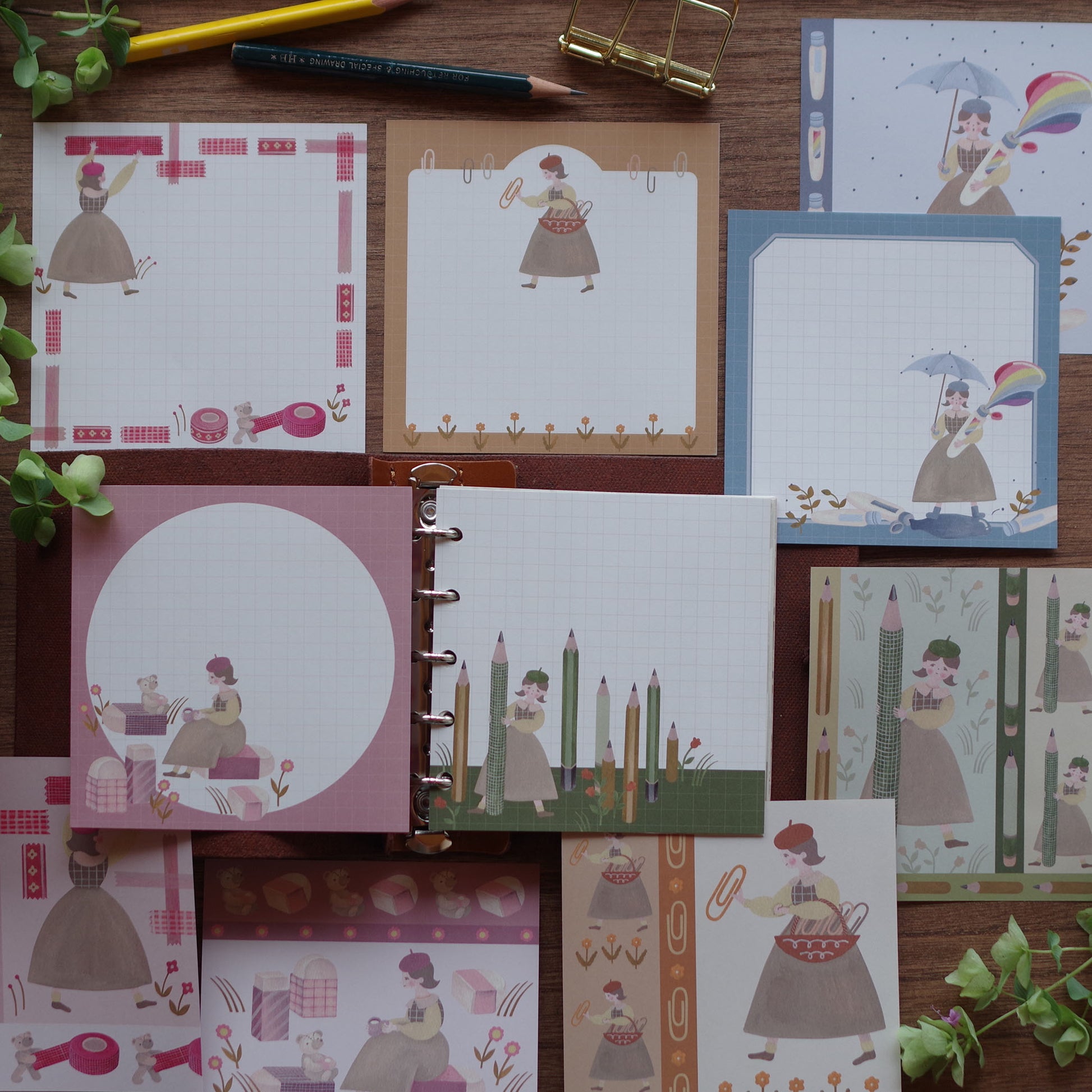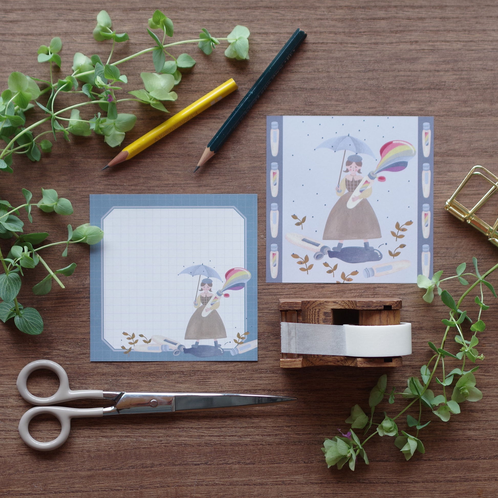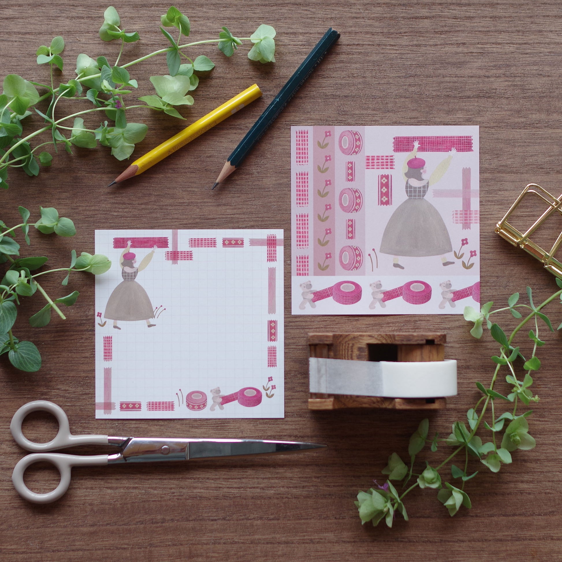 5種類のメモ用紙が10枚ずつ入った、50枚入りの正方形のメモ帳です。