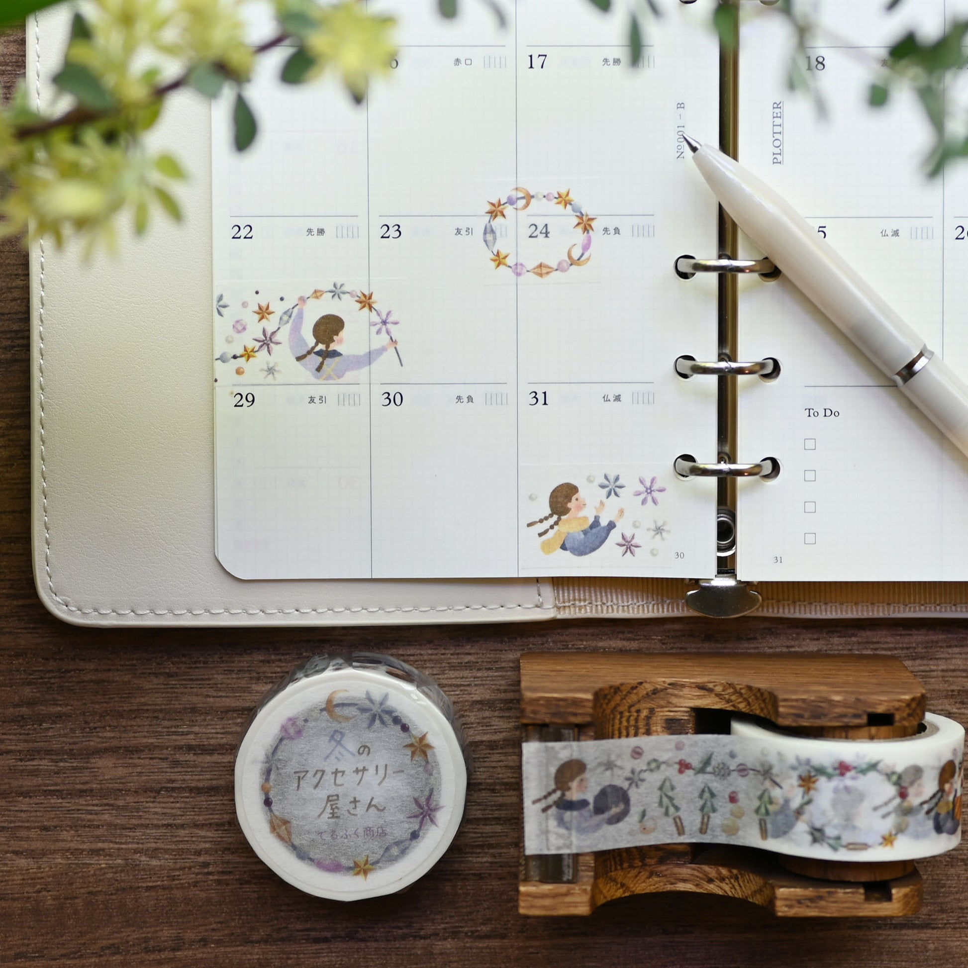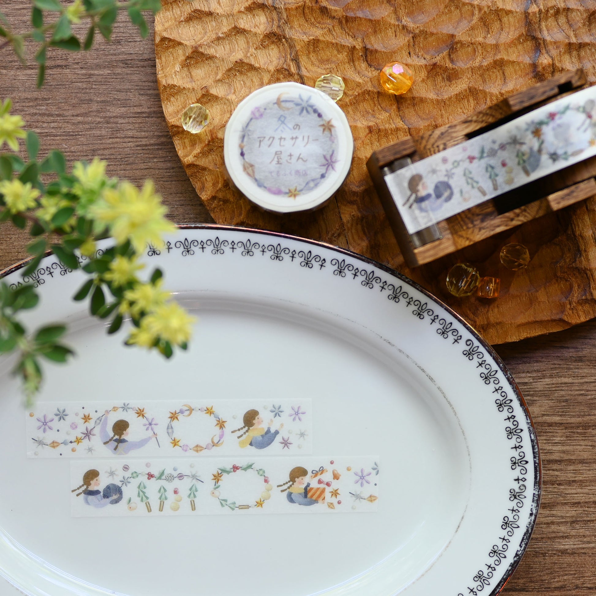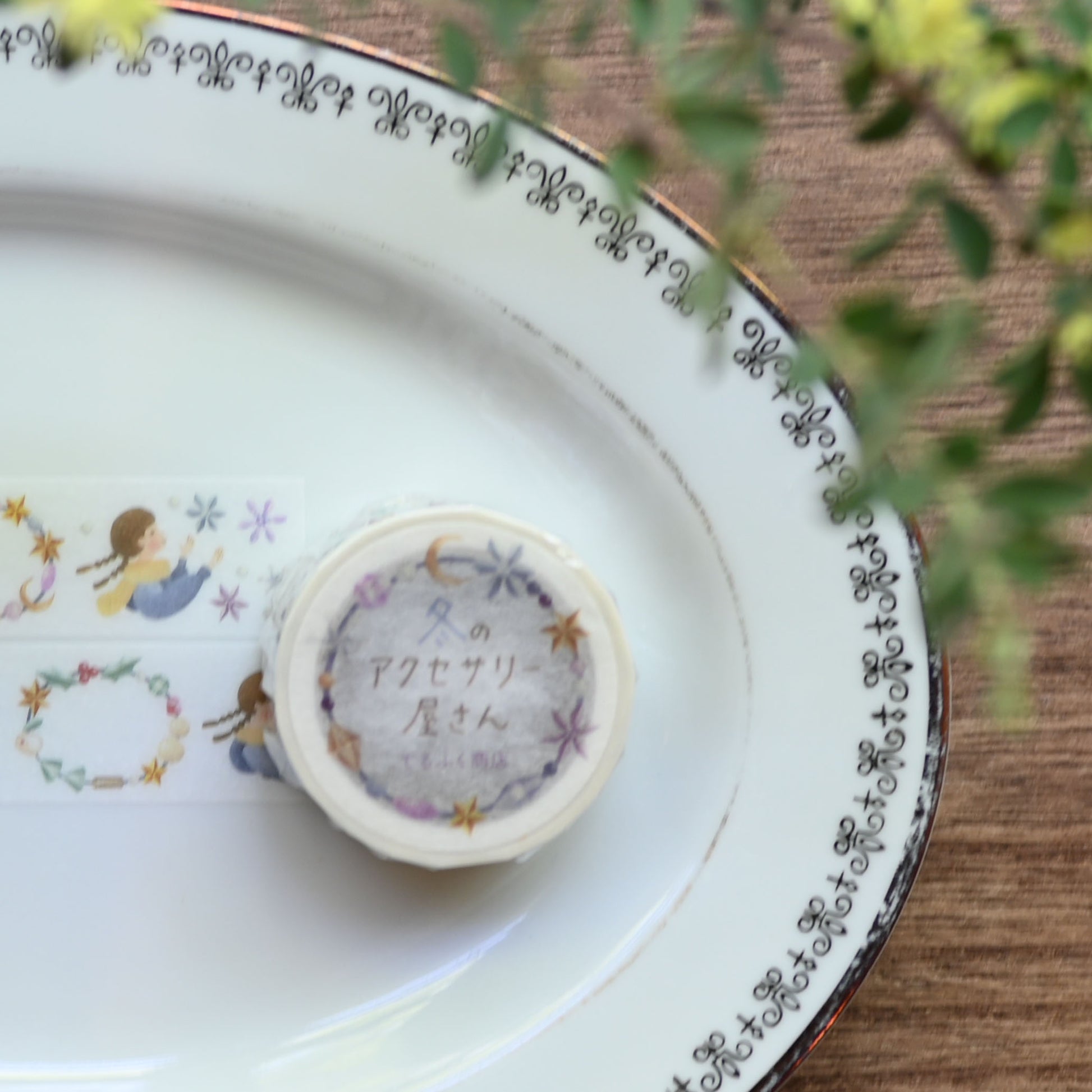 冬のビーズを集めてアクセサリー屋さんを開く女の子を描きました。