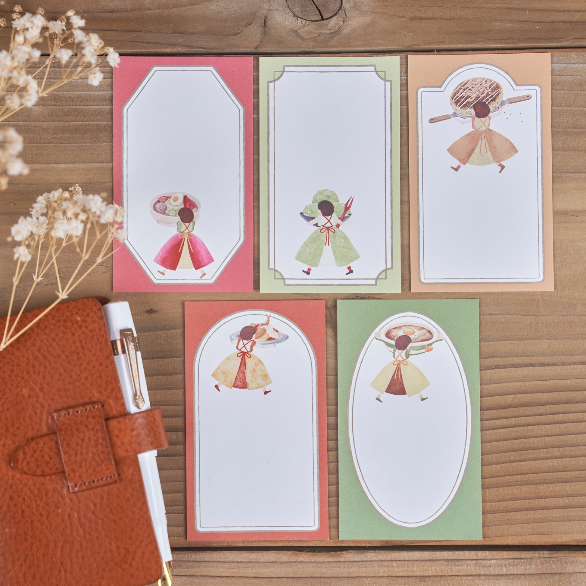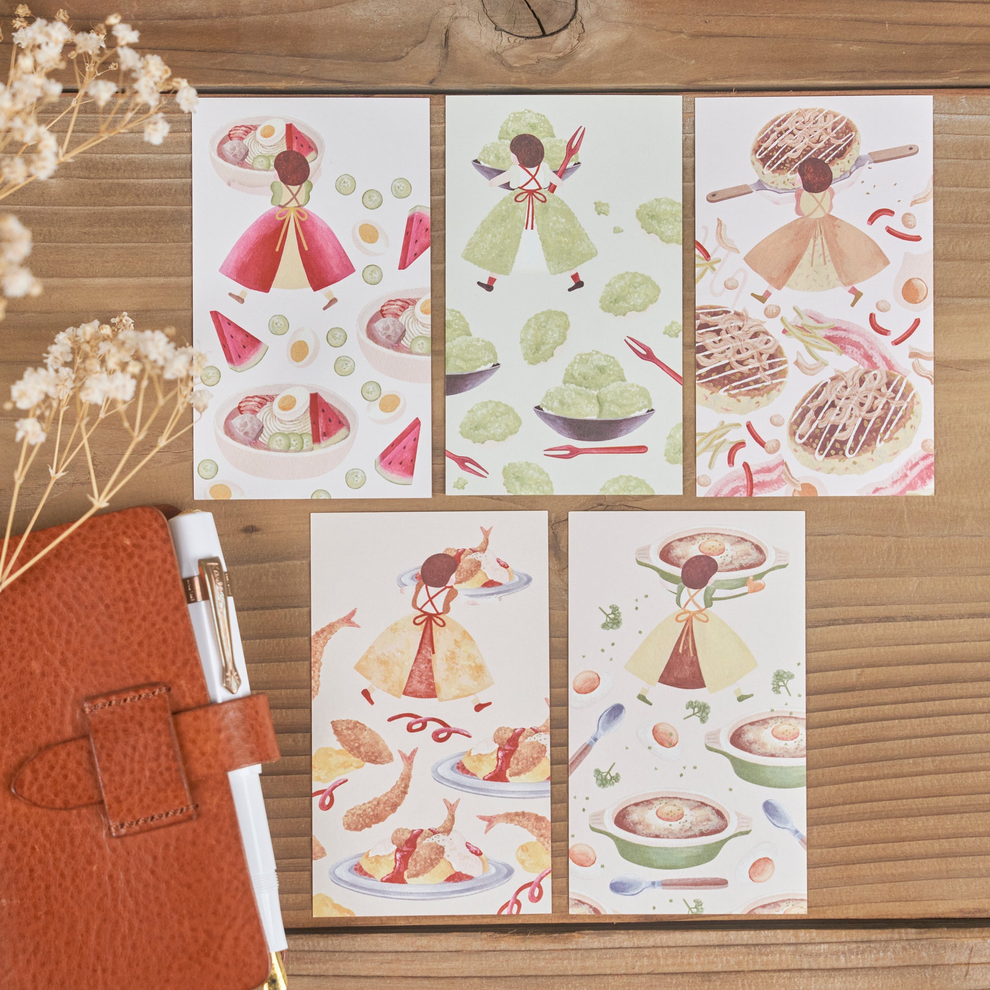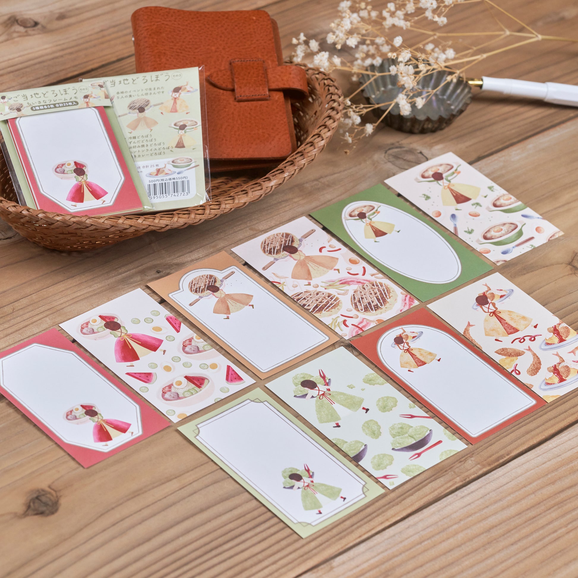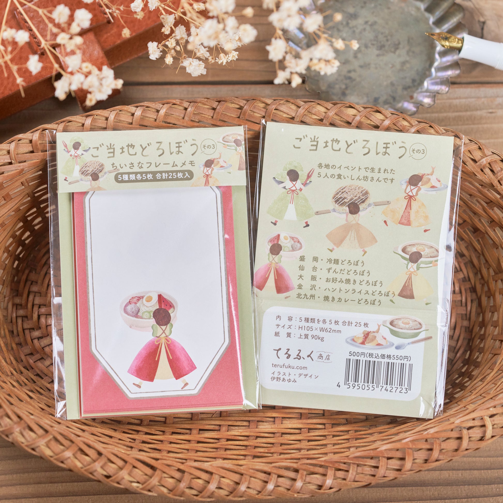 盛岡の「冷麺」、仙台の「ずんだ」、大阪の「お好み焼き」、金沢の「ハントンライス」、北九州の「焼きカレー」の5種類のメモ紙をイラストとフレームでデザインしています。