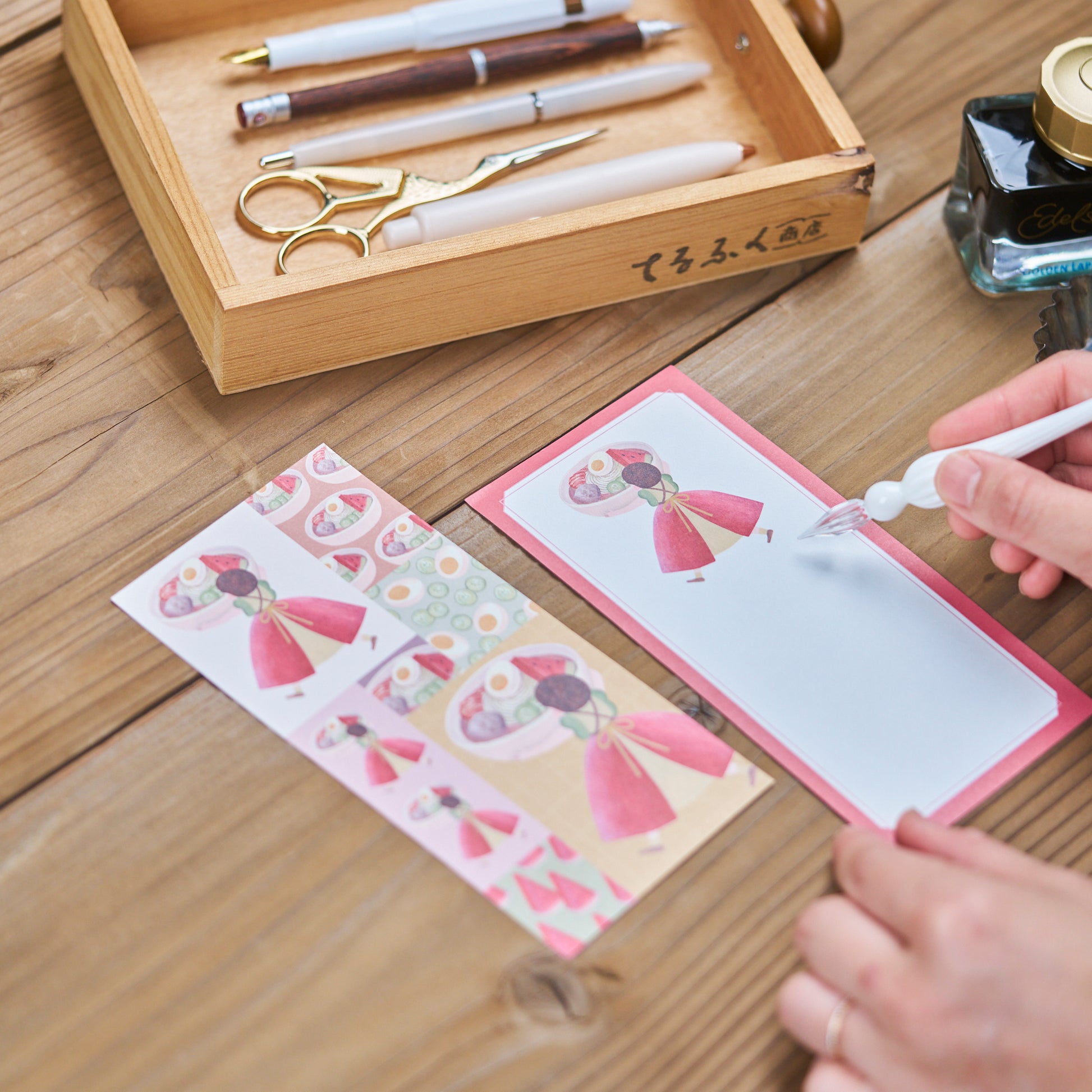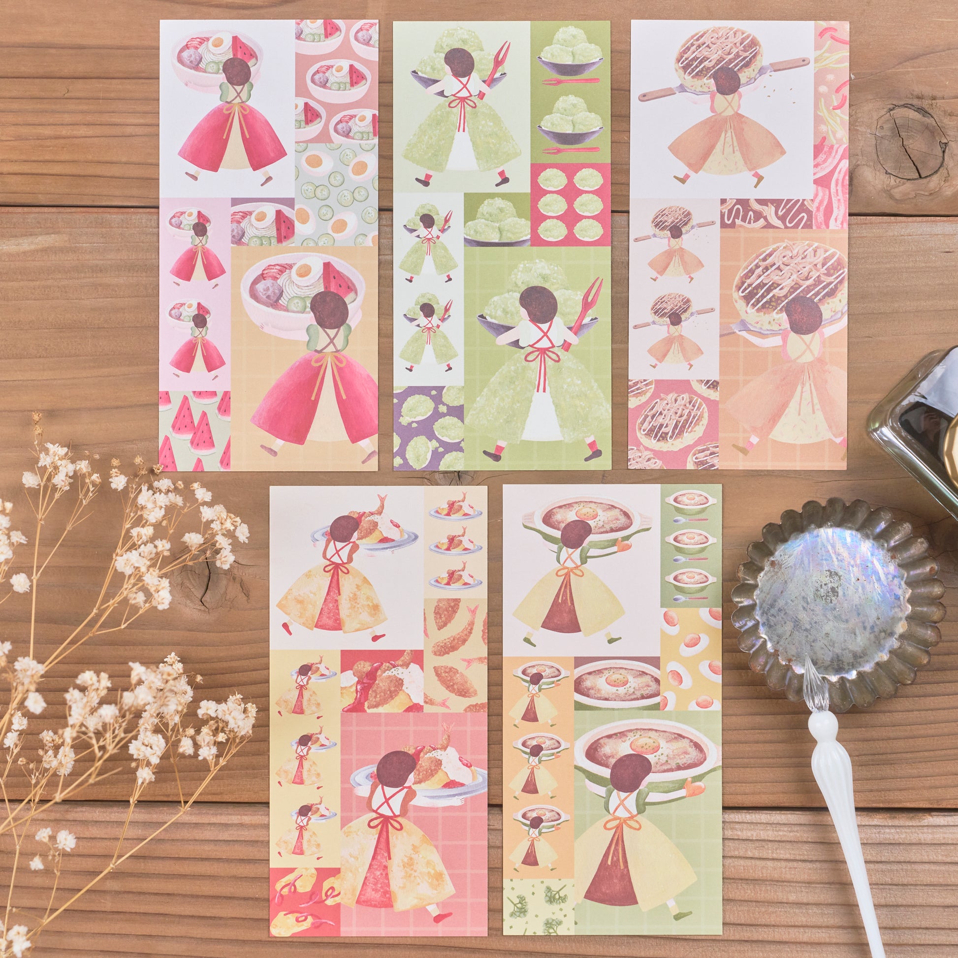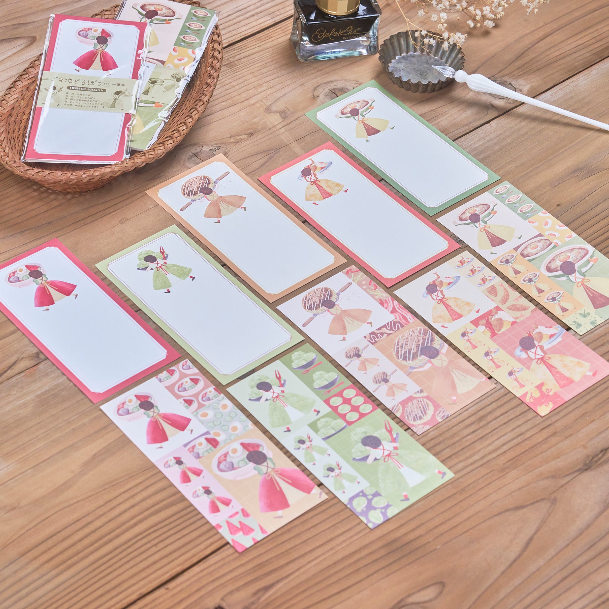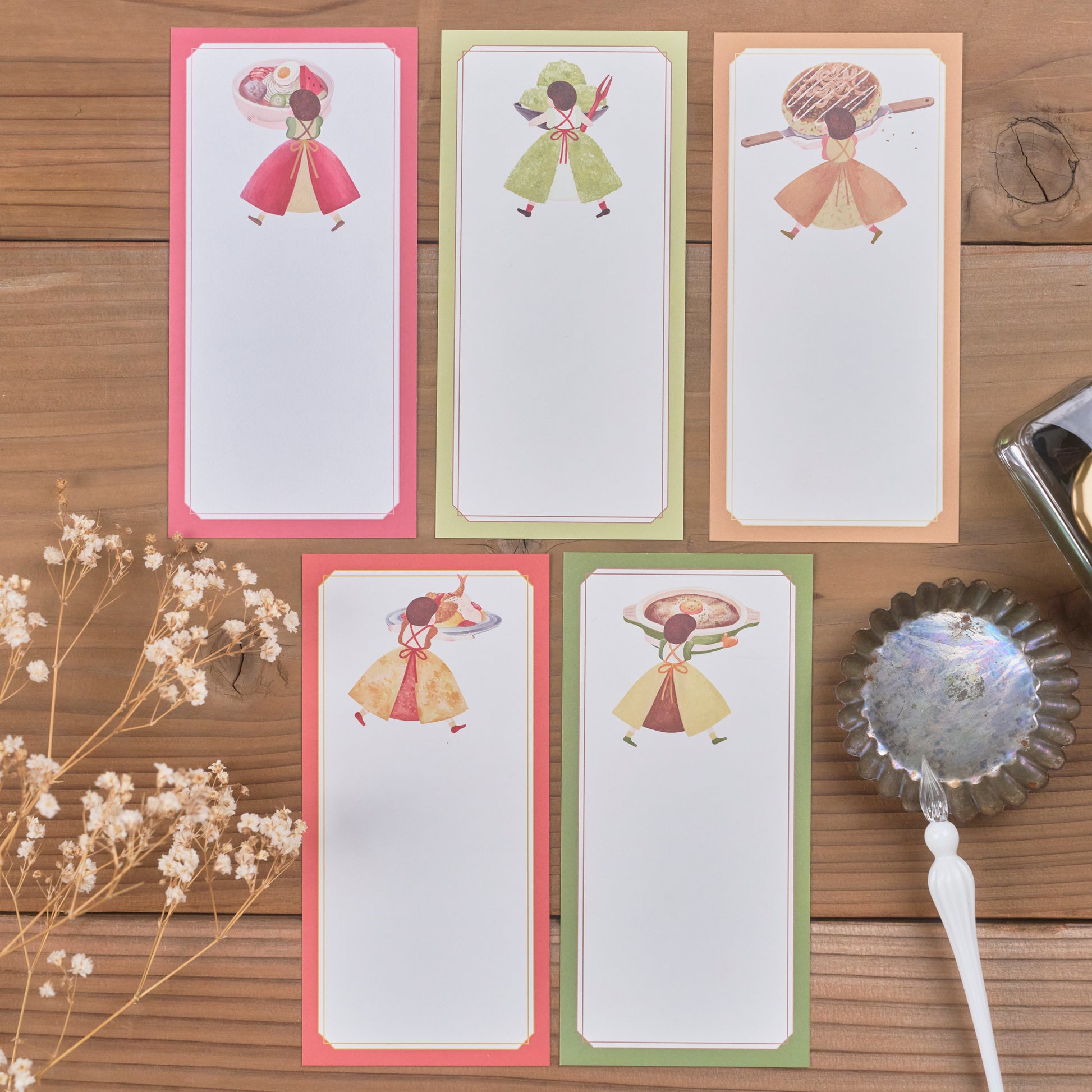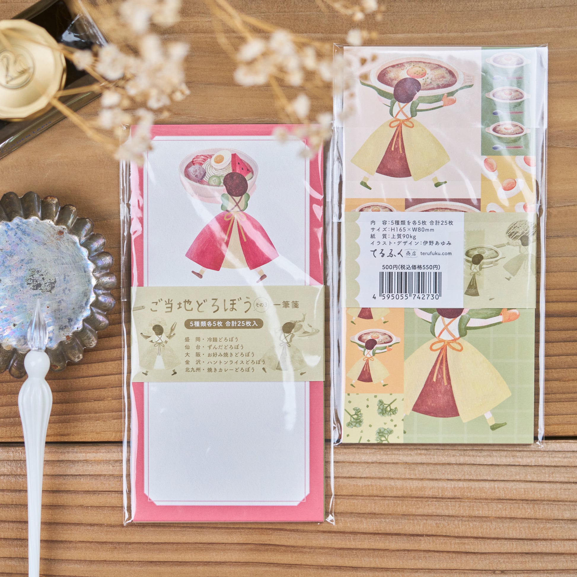 盛岡の「冷麺」、仙台の「ずんだ」、大阪の「お好み焼き」、金沢の「ハントンライス」、北九州の「焼きカレー」を持っていく女の子たちの一筆箋です。