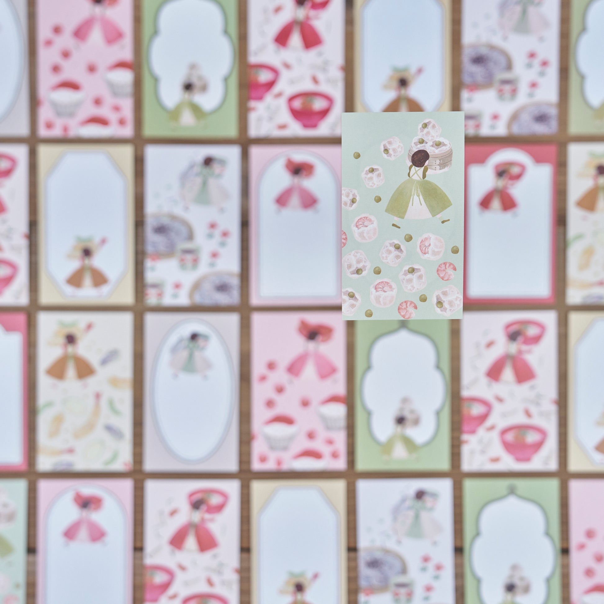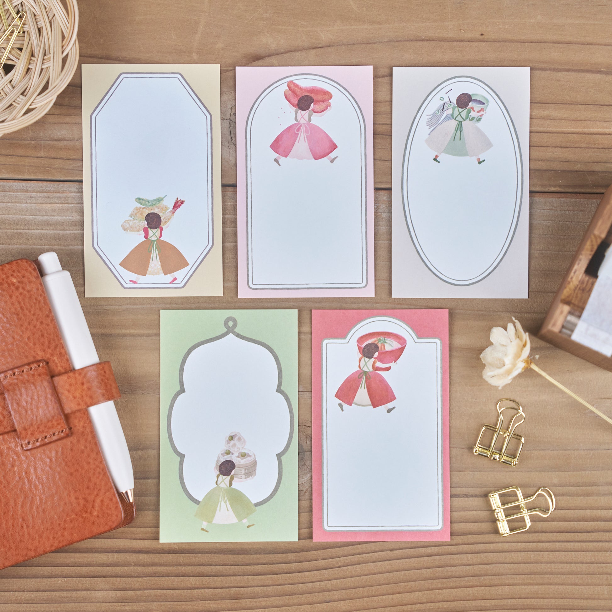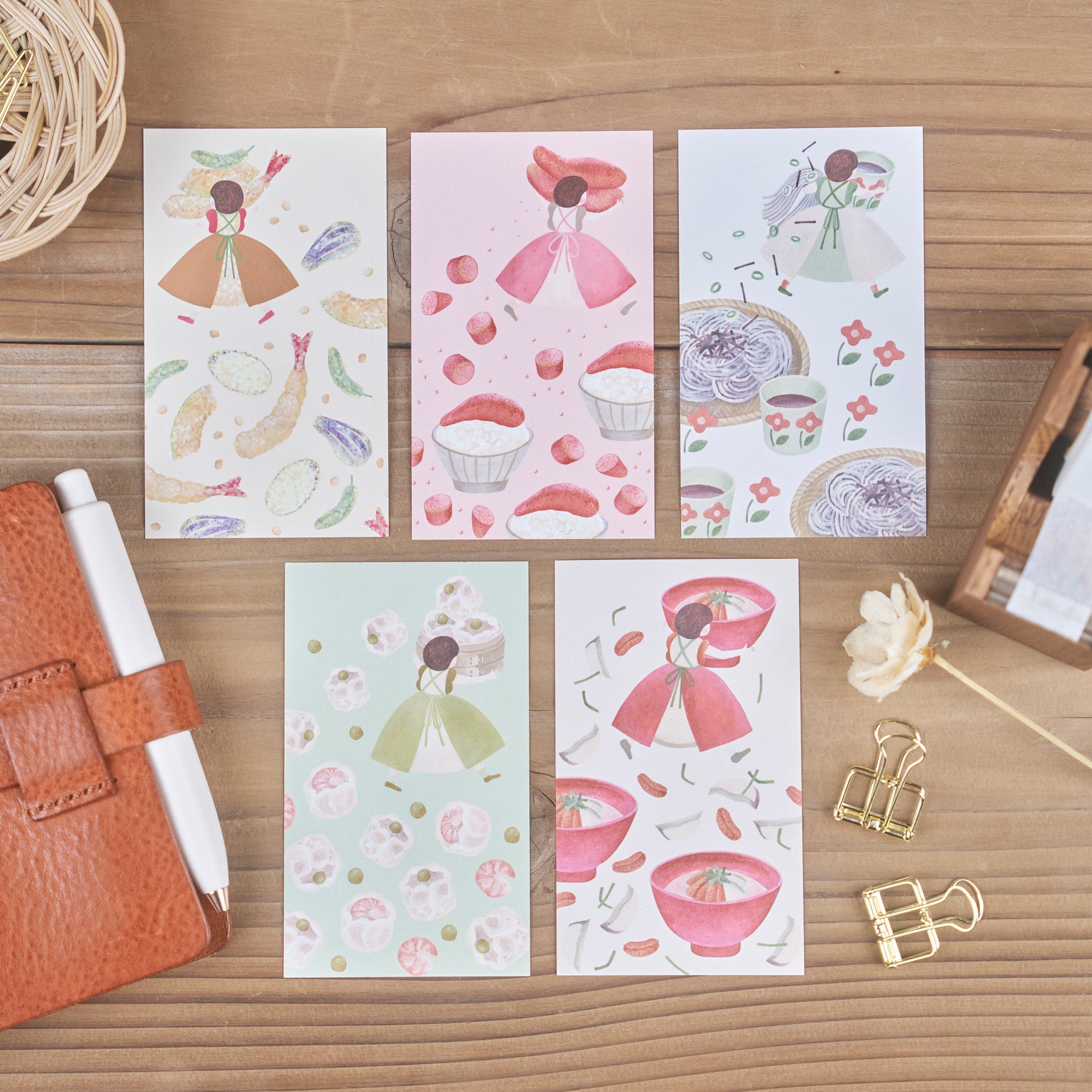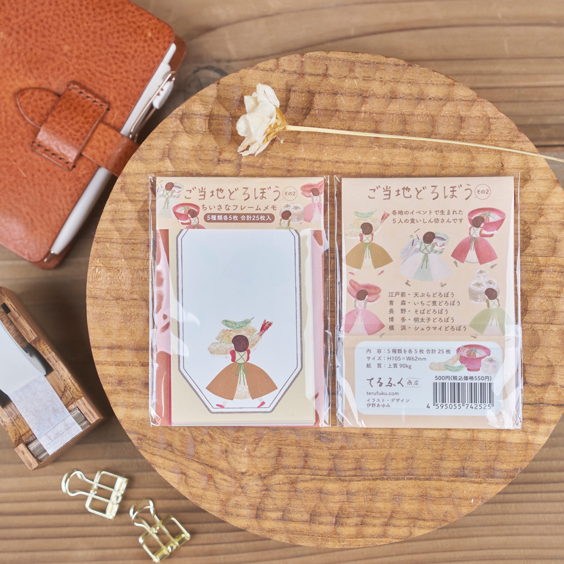 江戸前「天ぷら」、青森の「いちご煮」、長野の「蕎麦」、博多の「明太子」、横浜の「シュウマイ」の5種類のメモ紙をイラストとフレームでデザインしています。