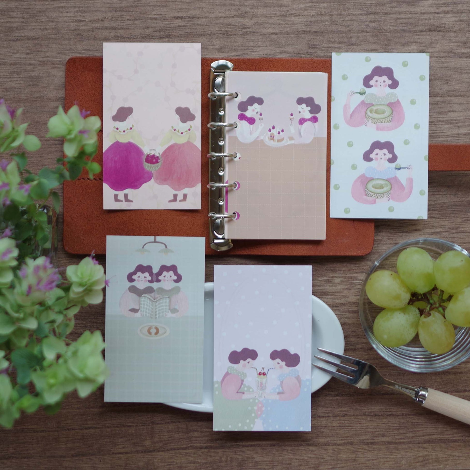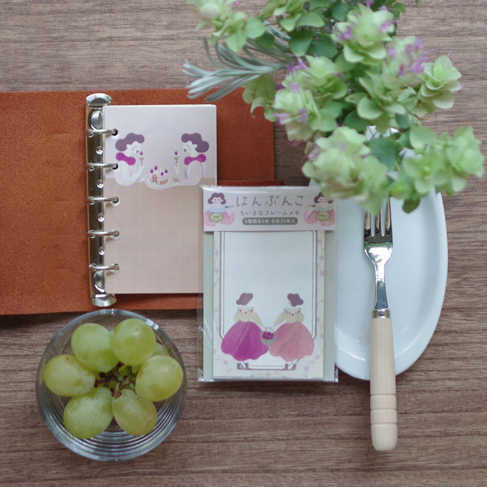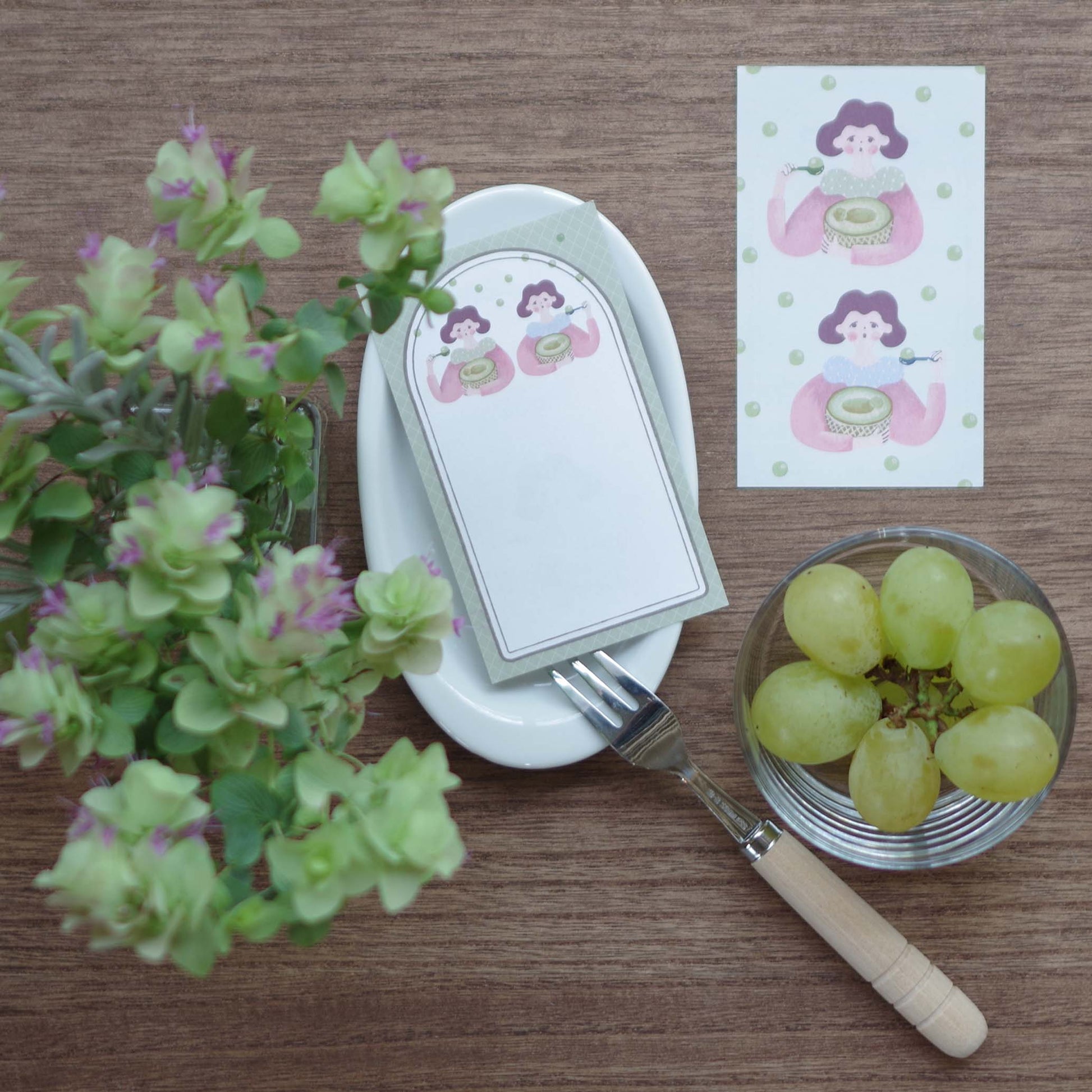 「りんご」「ケーキ」「クリームソーダ」「メロン」「本」5種類のメモ紙をイラストとフレームでデザインしています。