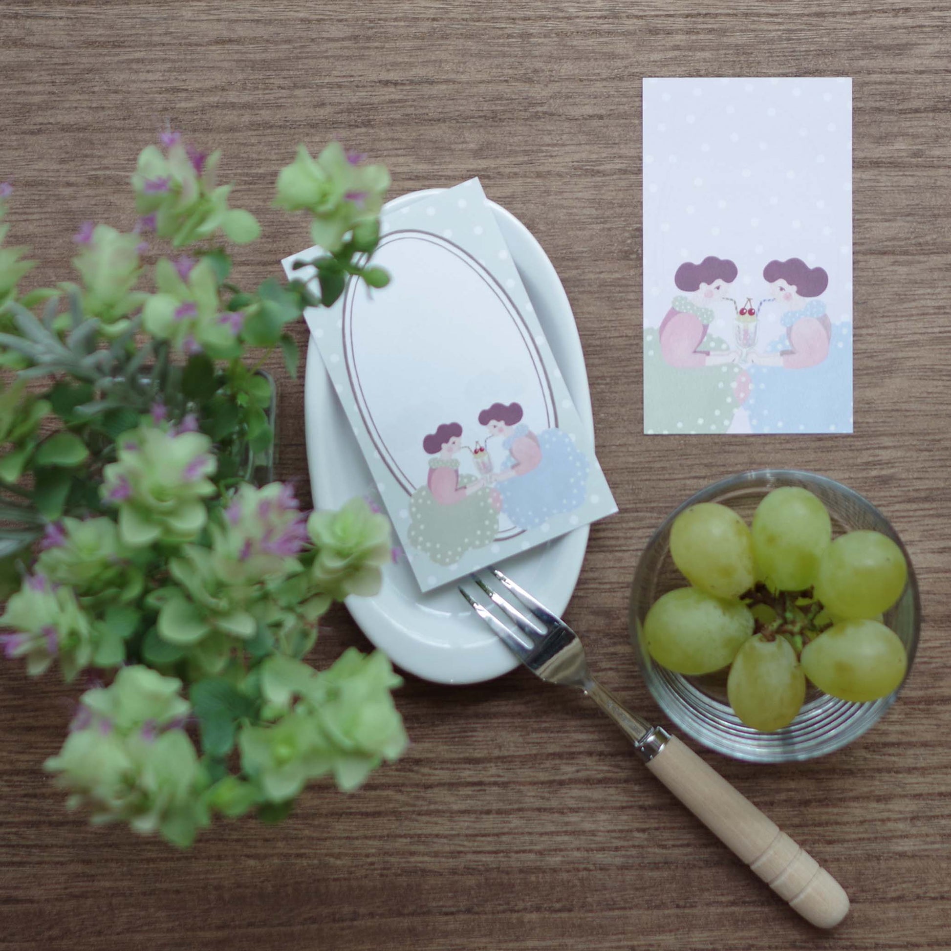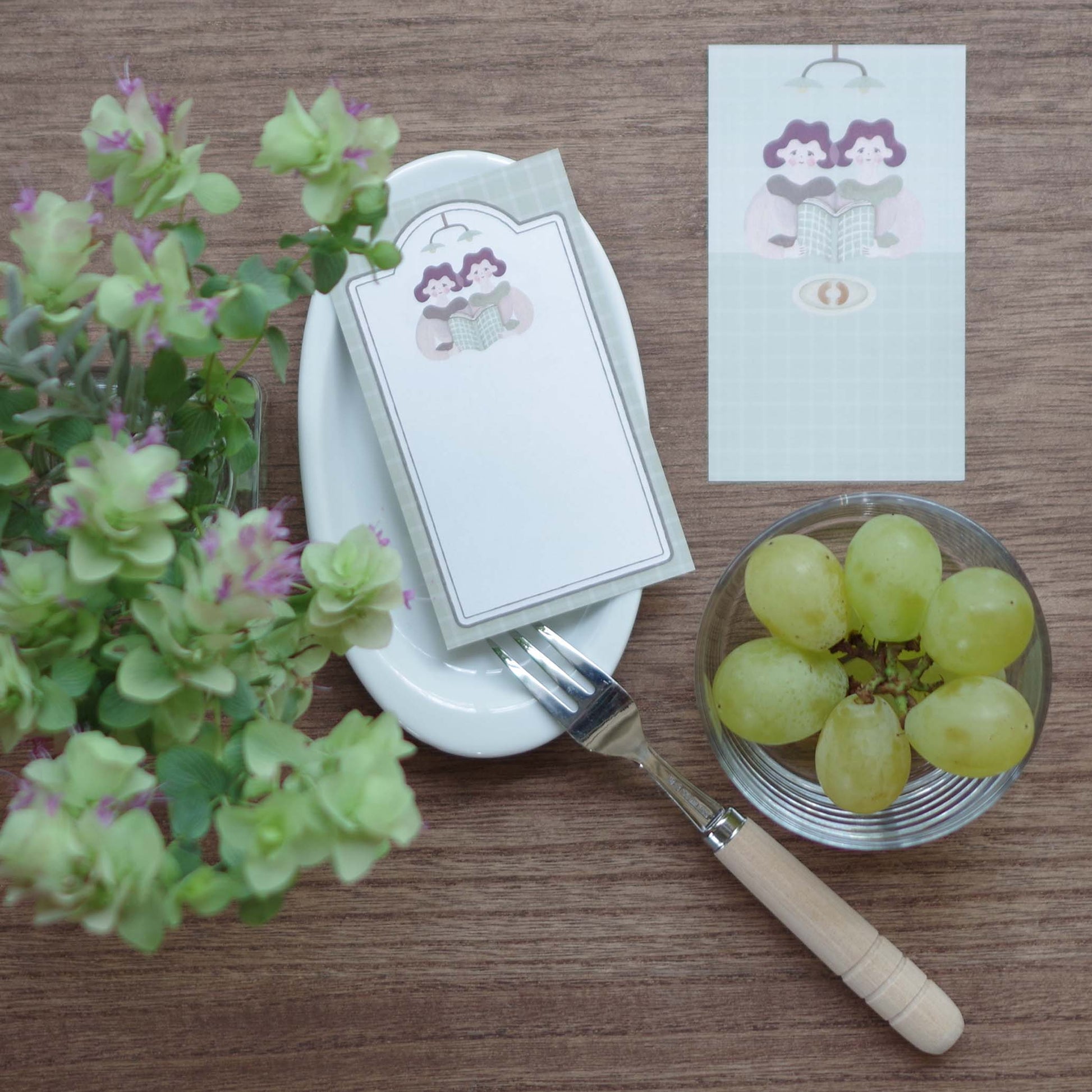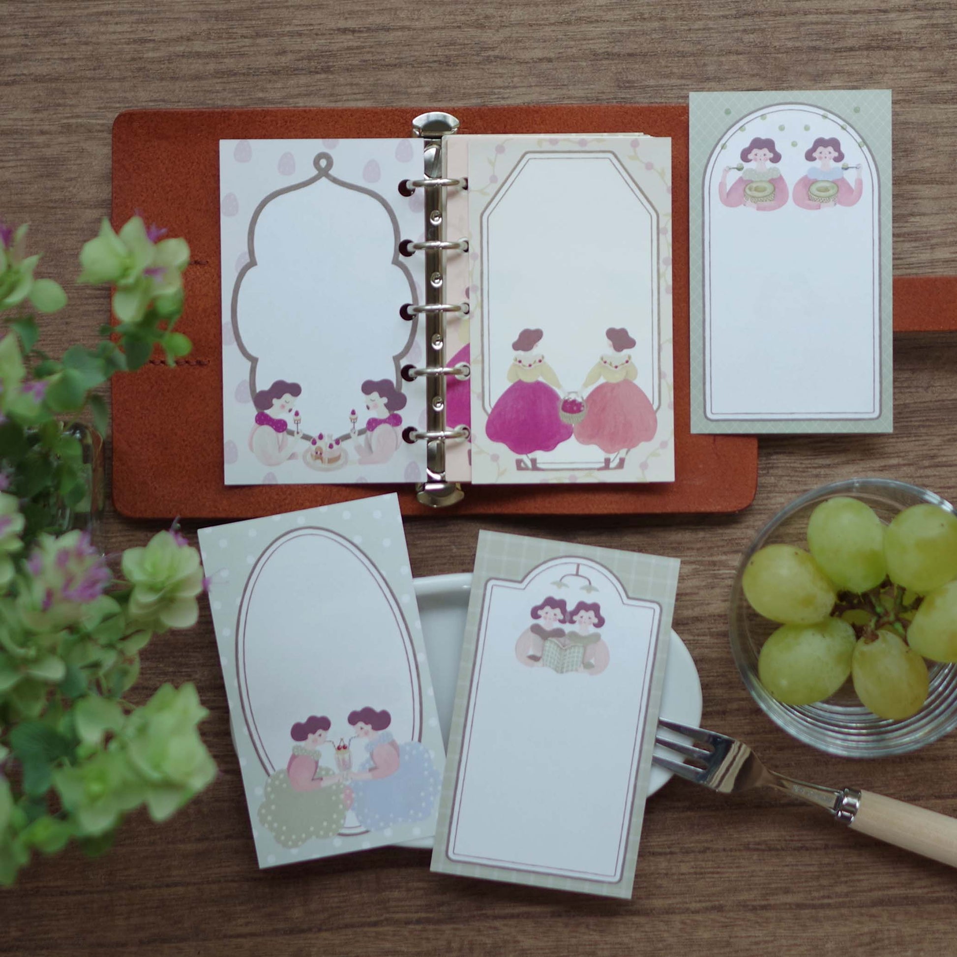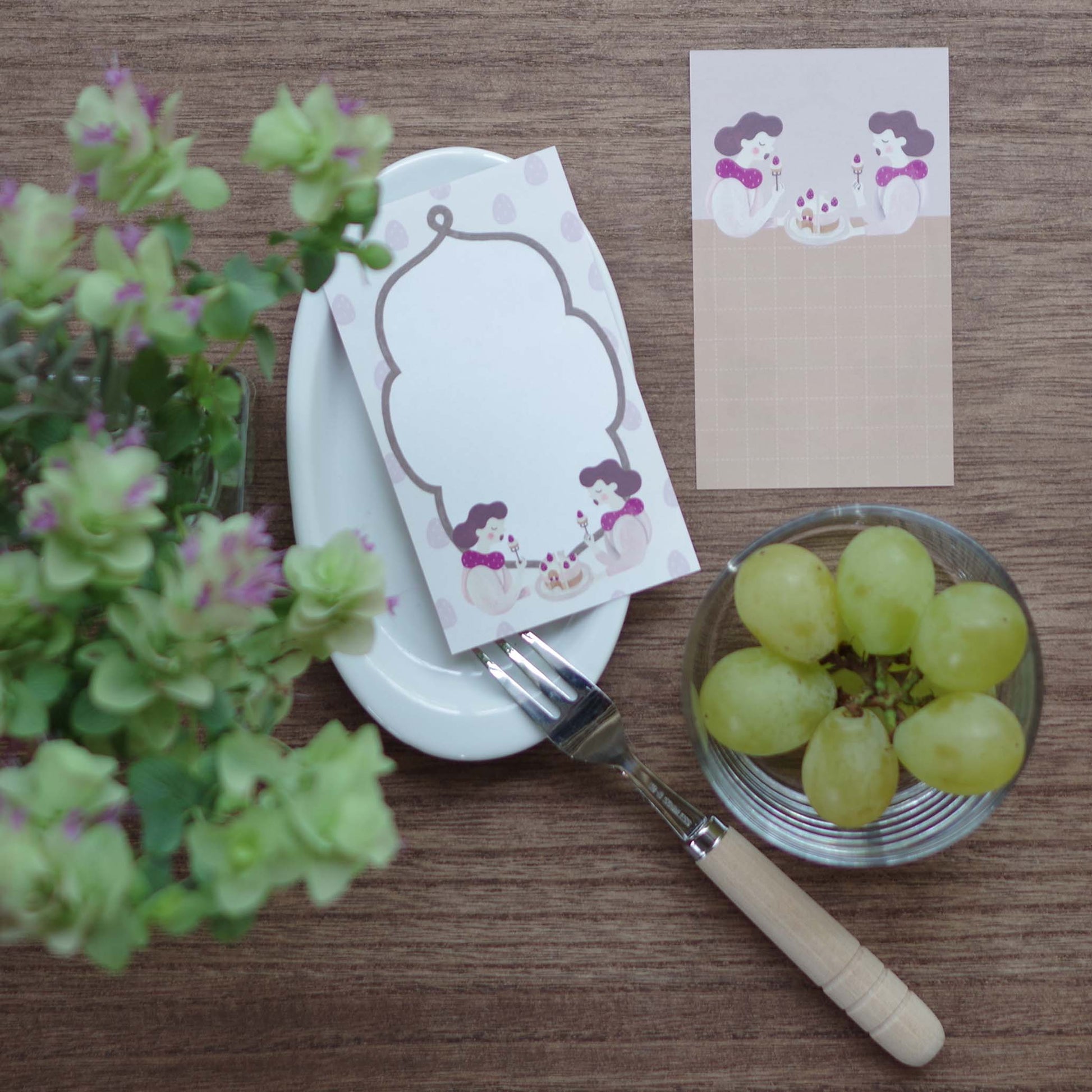 「りんご」「ケーキ」「クリームソーダ」「メロン」「本」5種類のメモ紙をイラストとフレームでデザインしています。