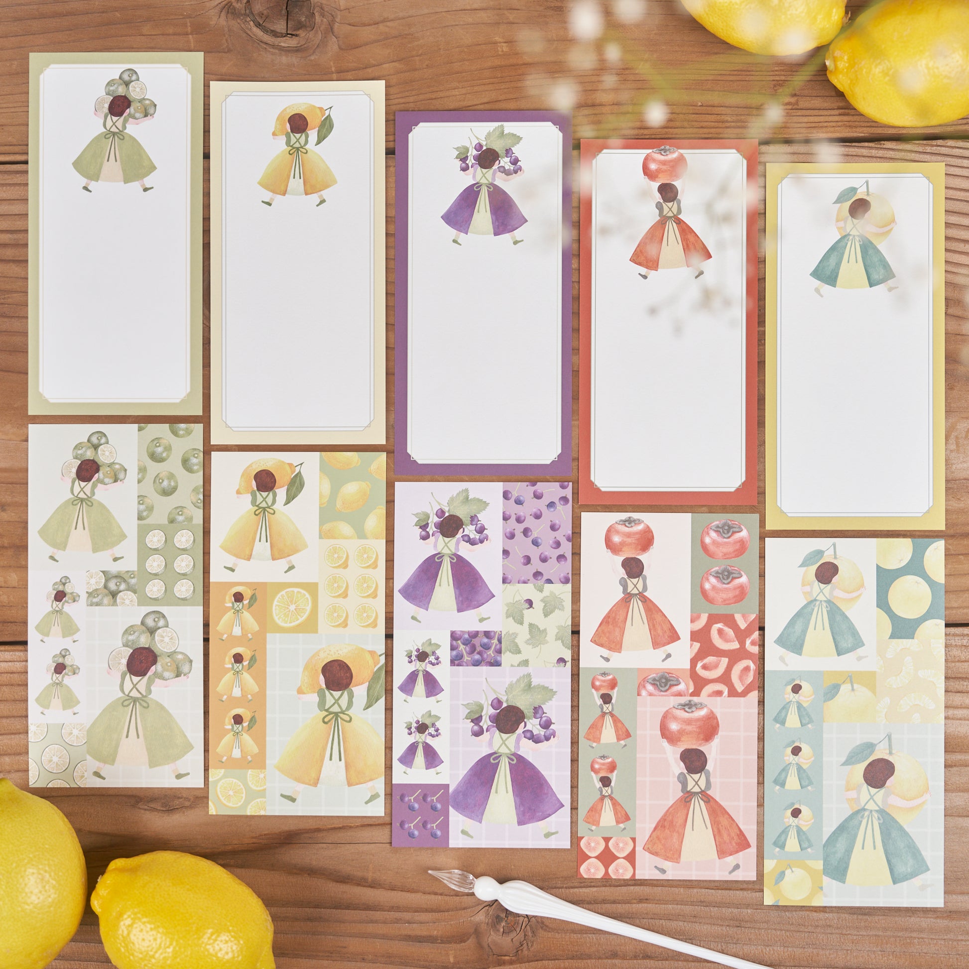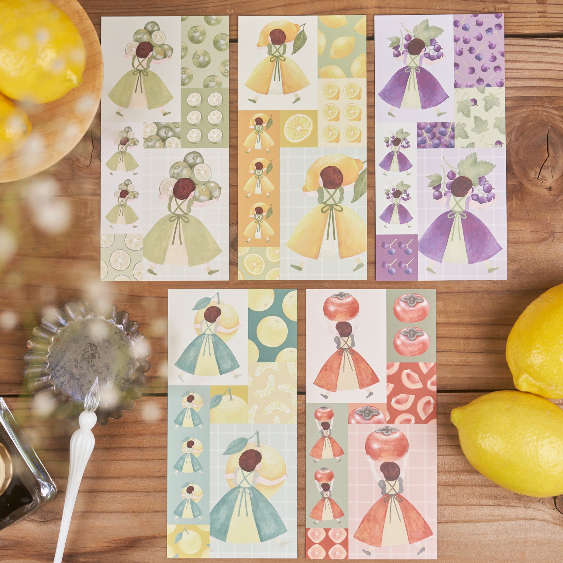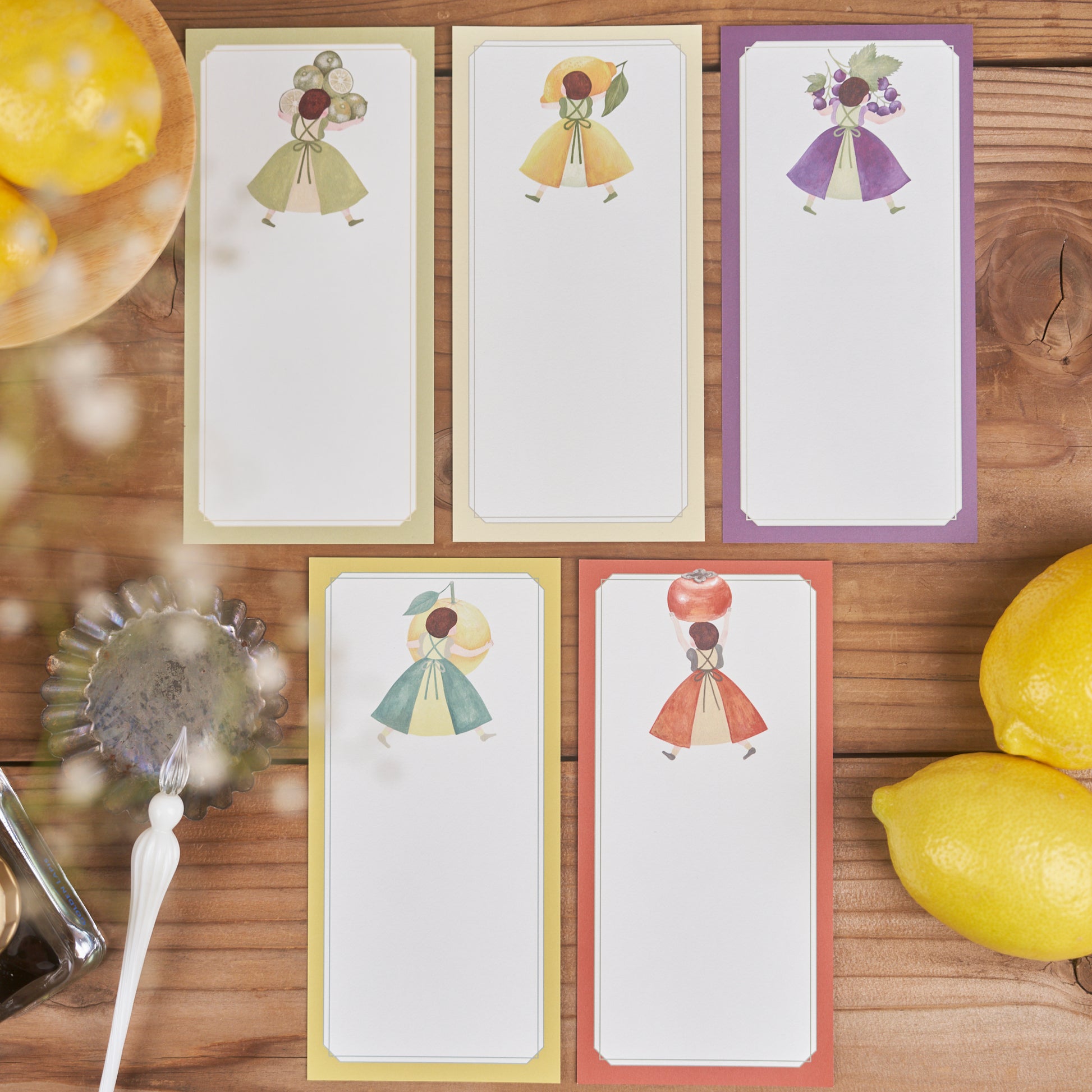 シークヮーサー、レモン、ぶどう、柿、文旦…くだものを持っていく女の子たちの一筆箋です。