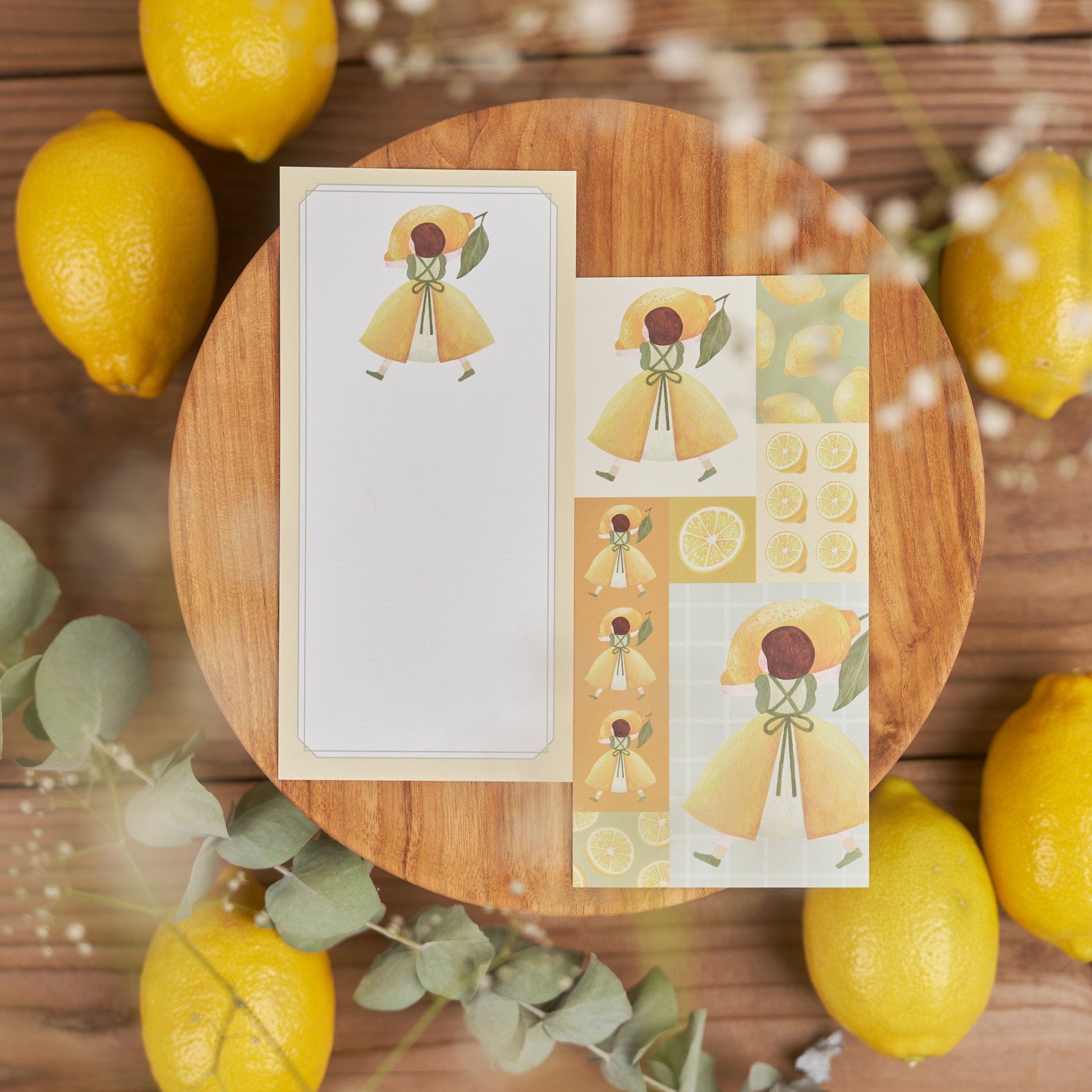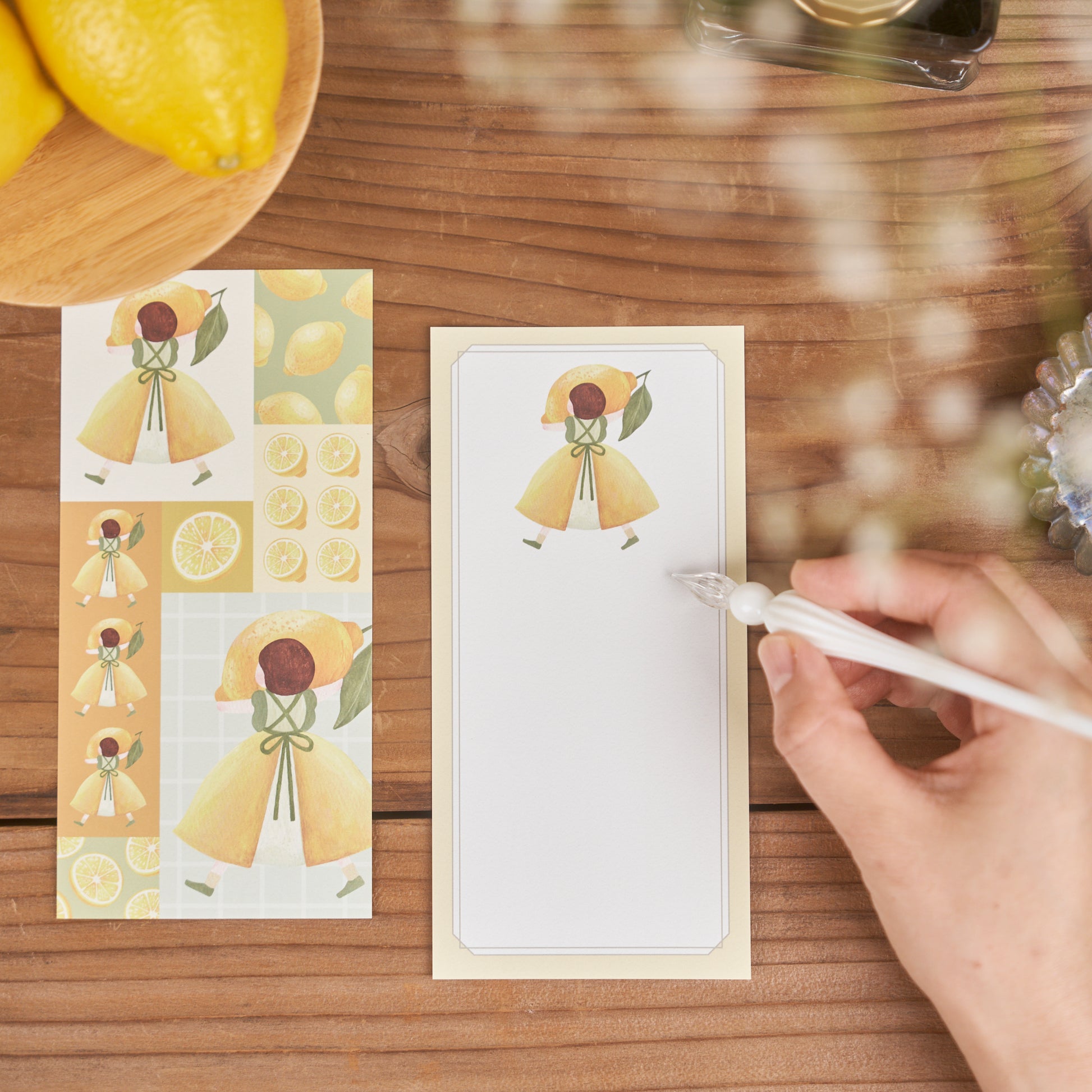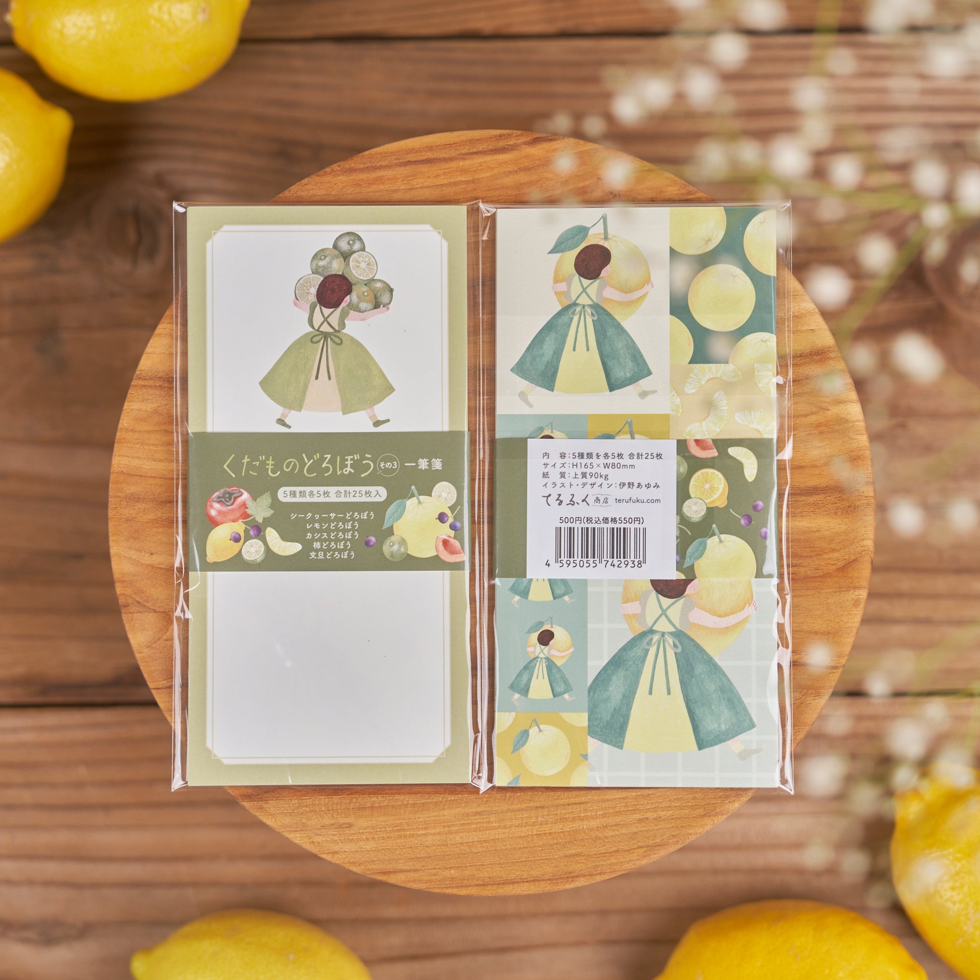 シークヮーサー、レモン、ぶどう、柿、文旦…くだものを持っていく女の子たちの一筆箋です。