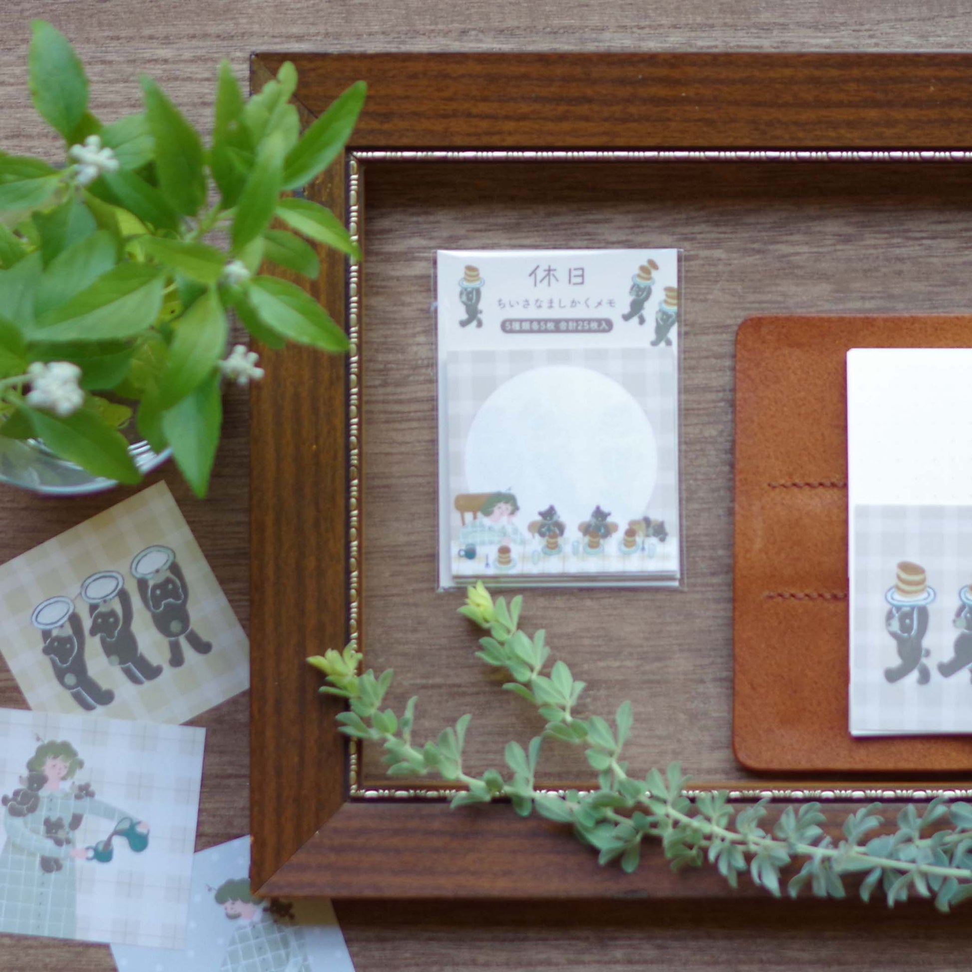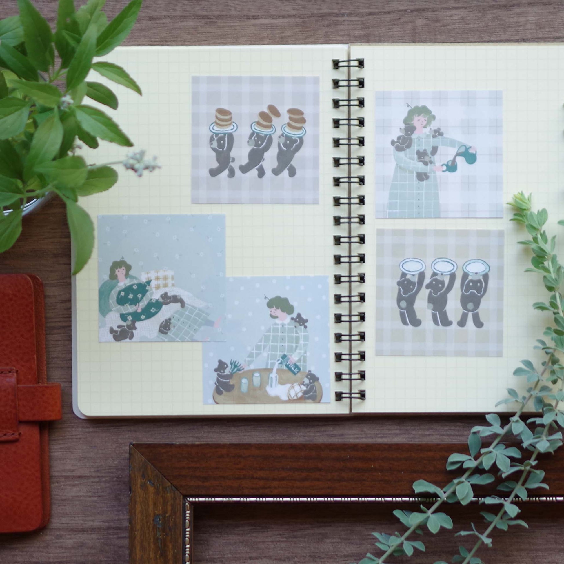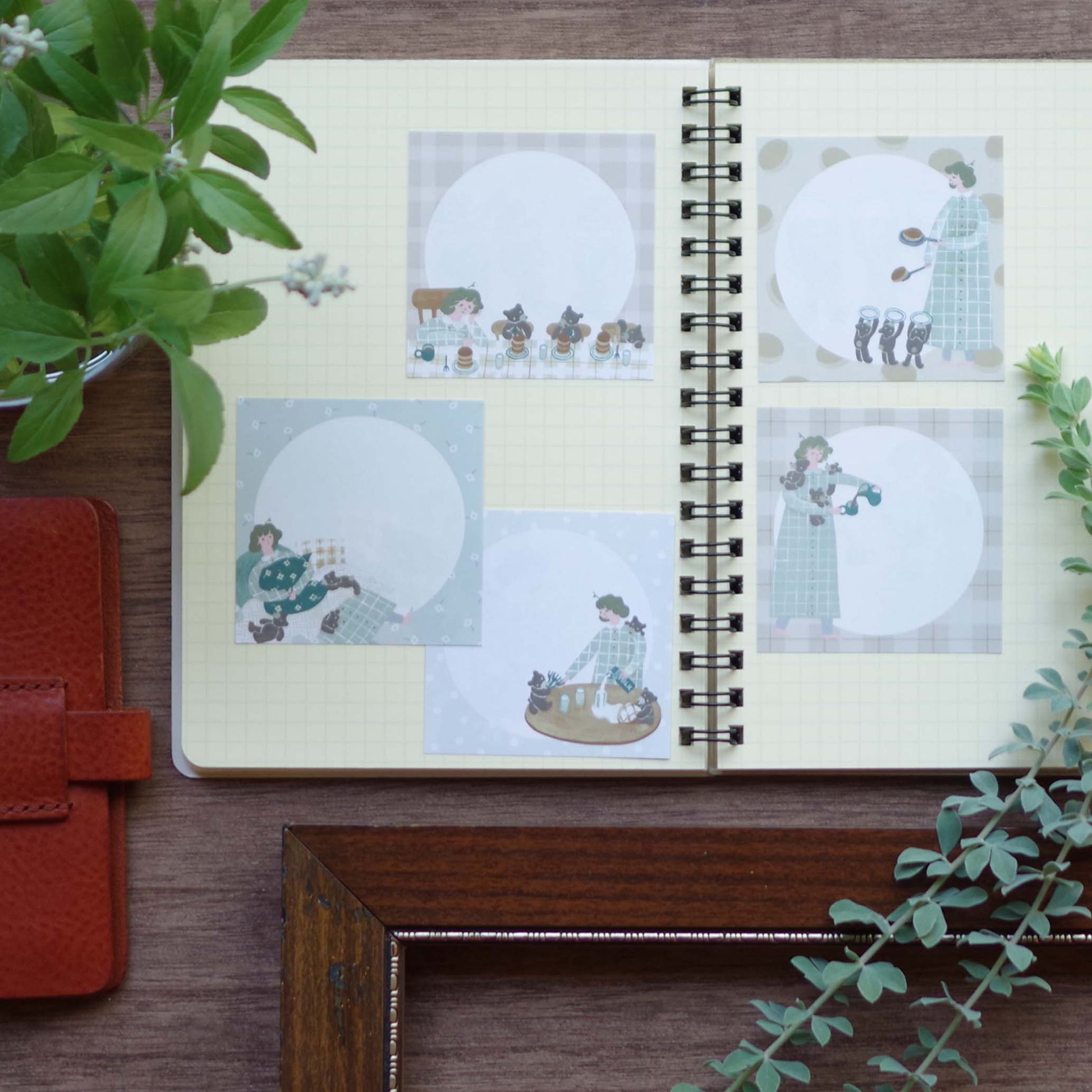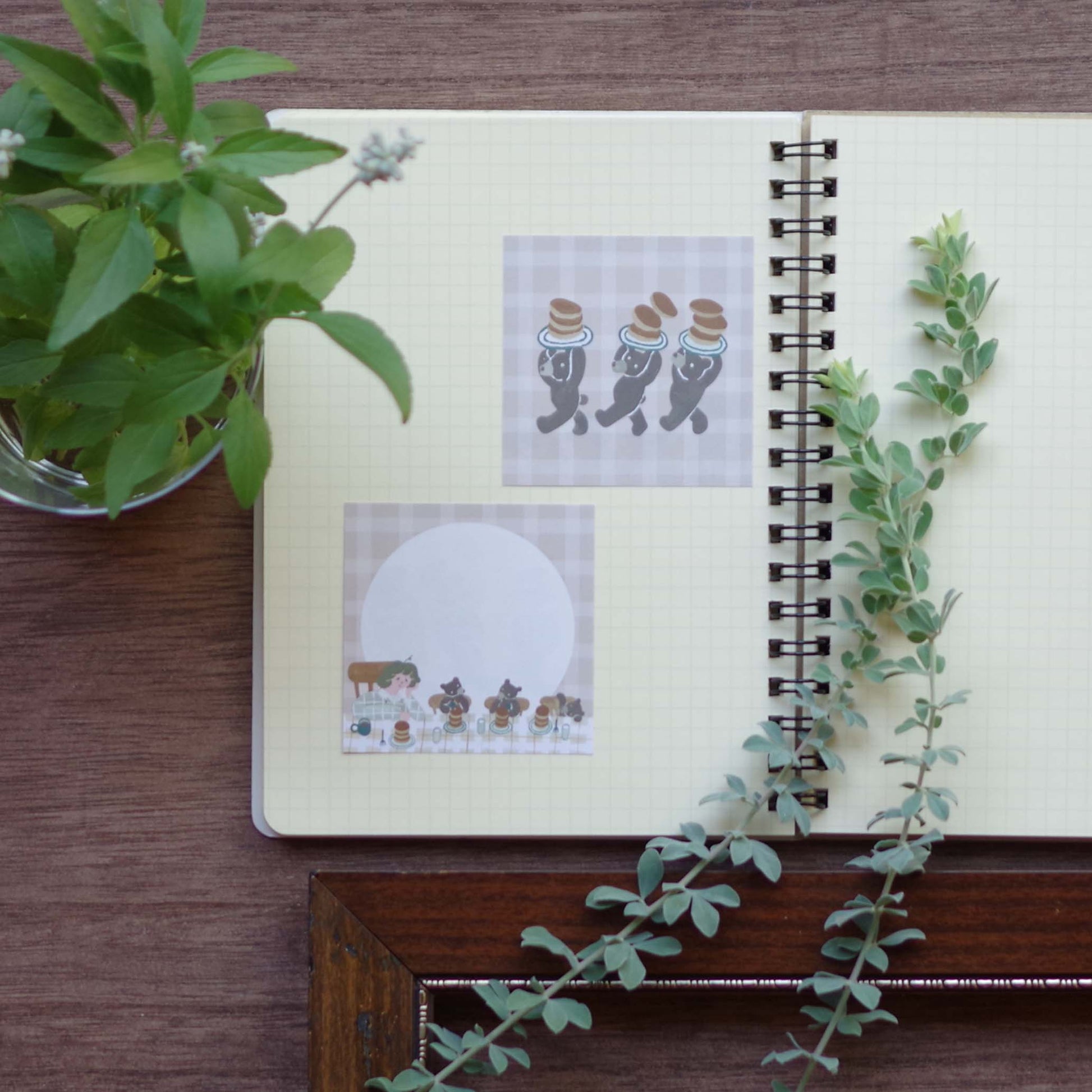 休日を過ごす子ぐまと女の子の、ちいさな正方形のメモ帳です。