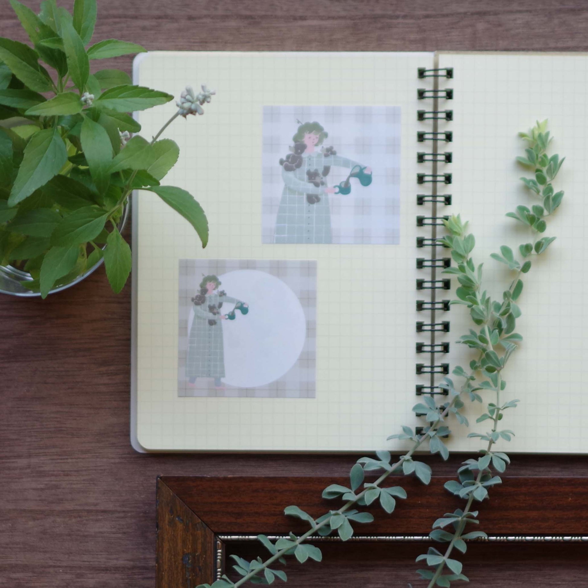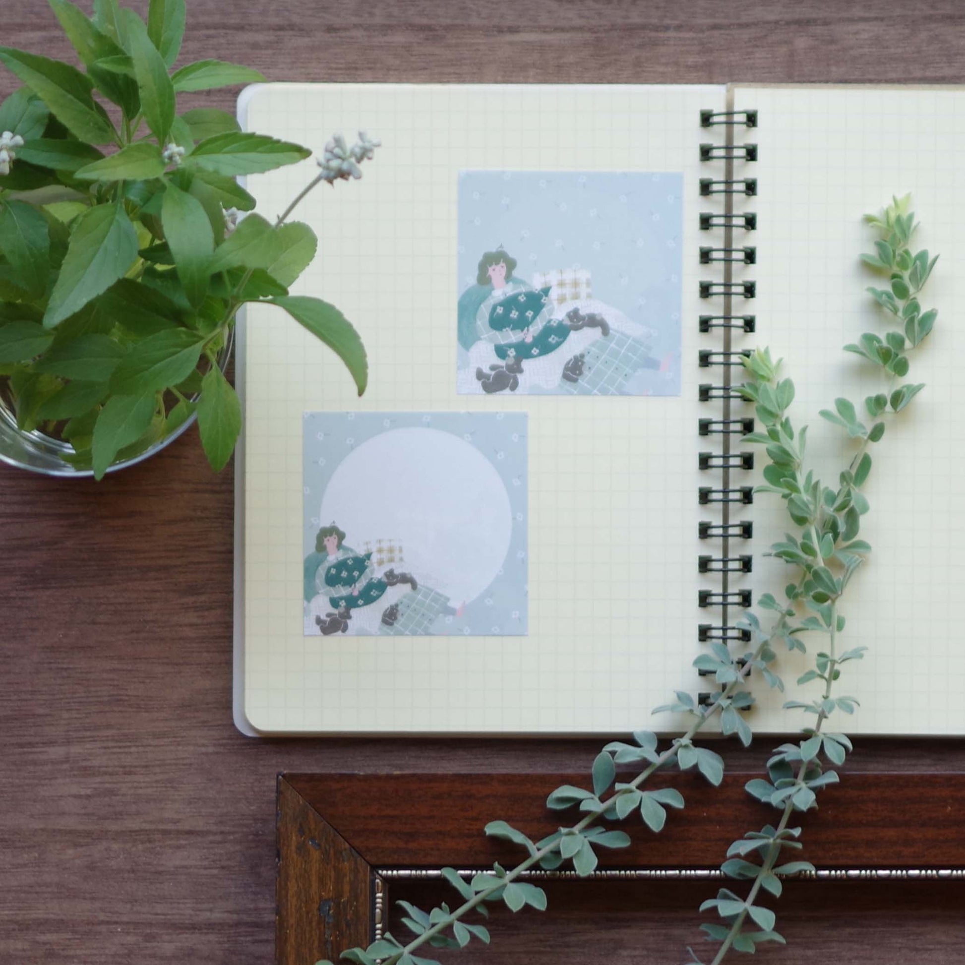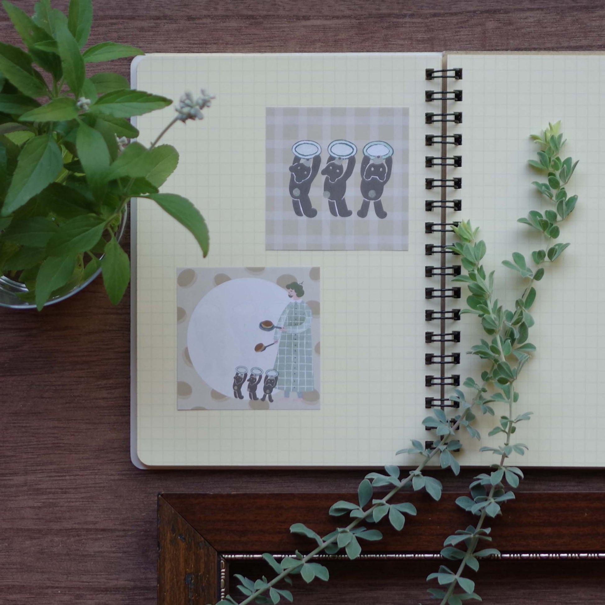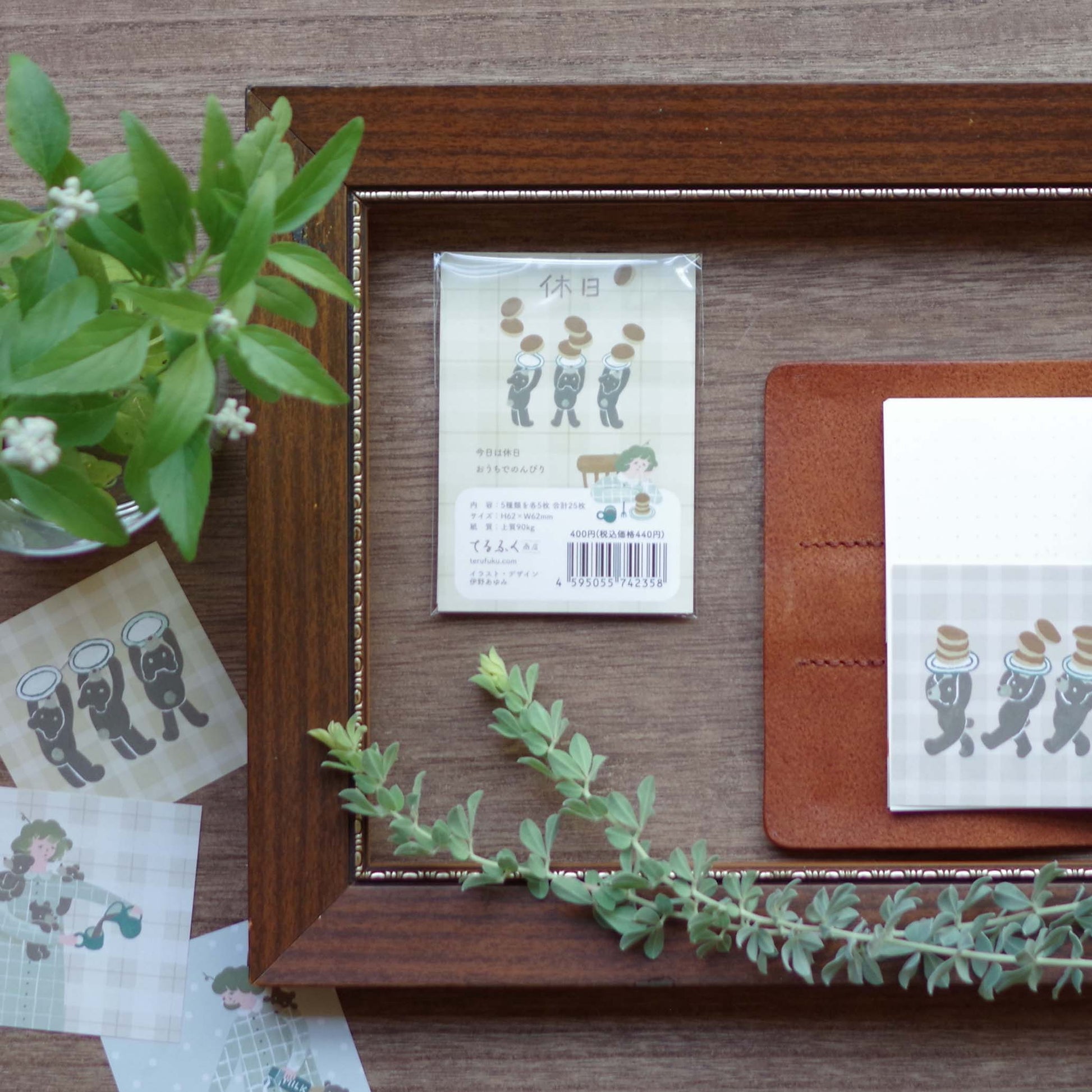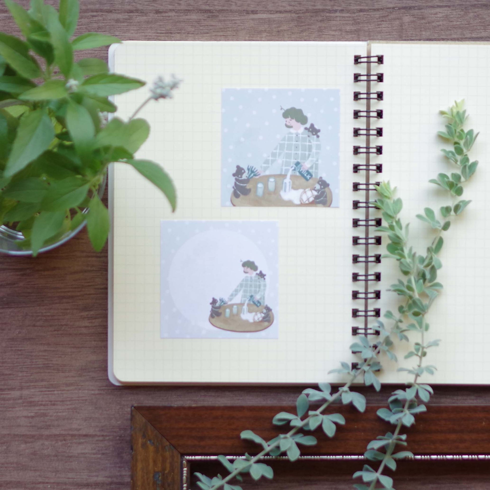 休日を過ごす子ぐまと女の子の、ちいさな正方形のメモ帳です。