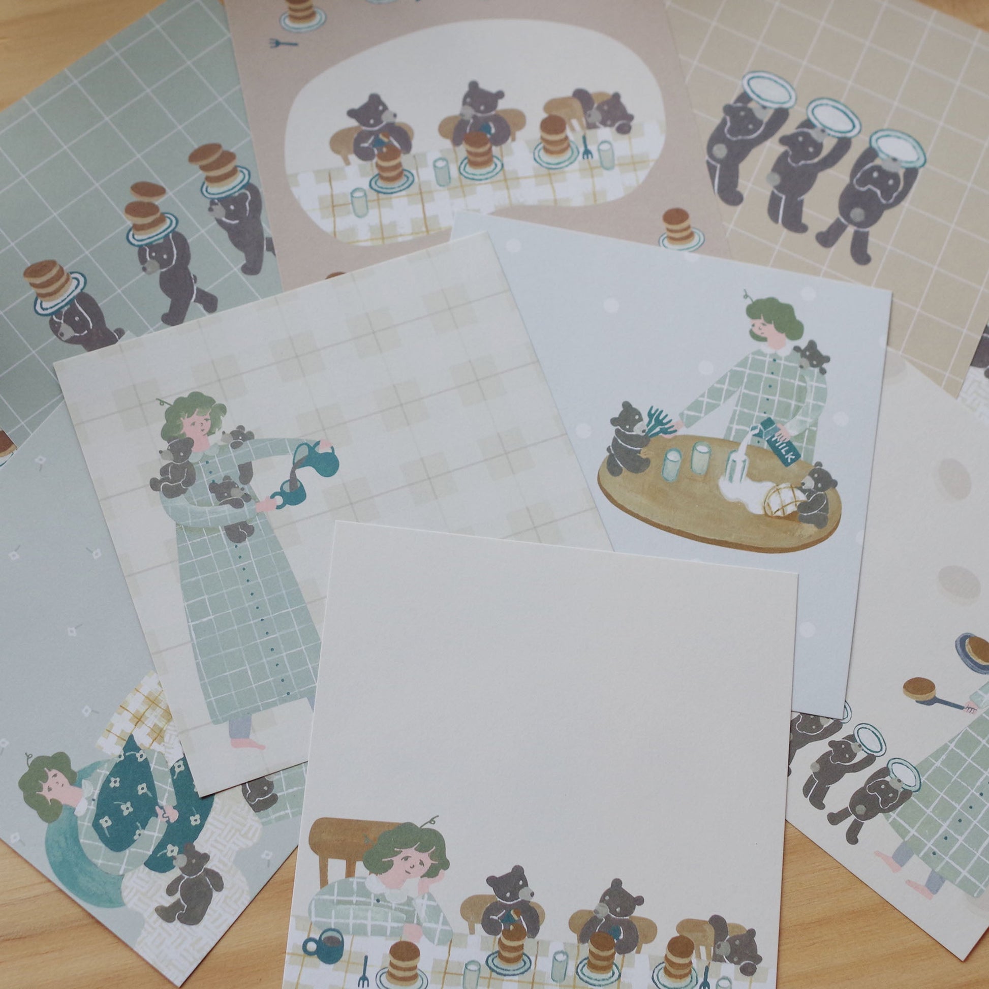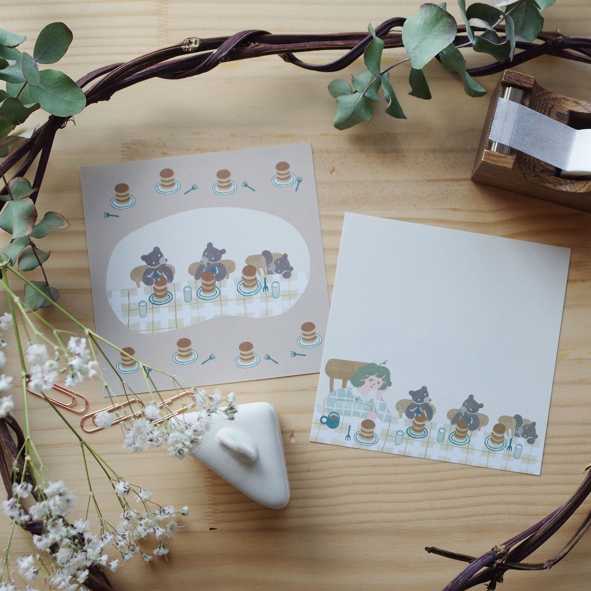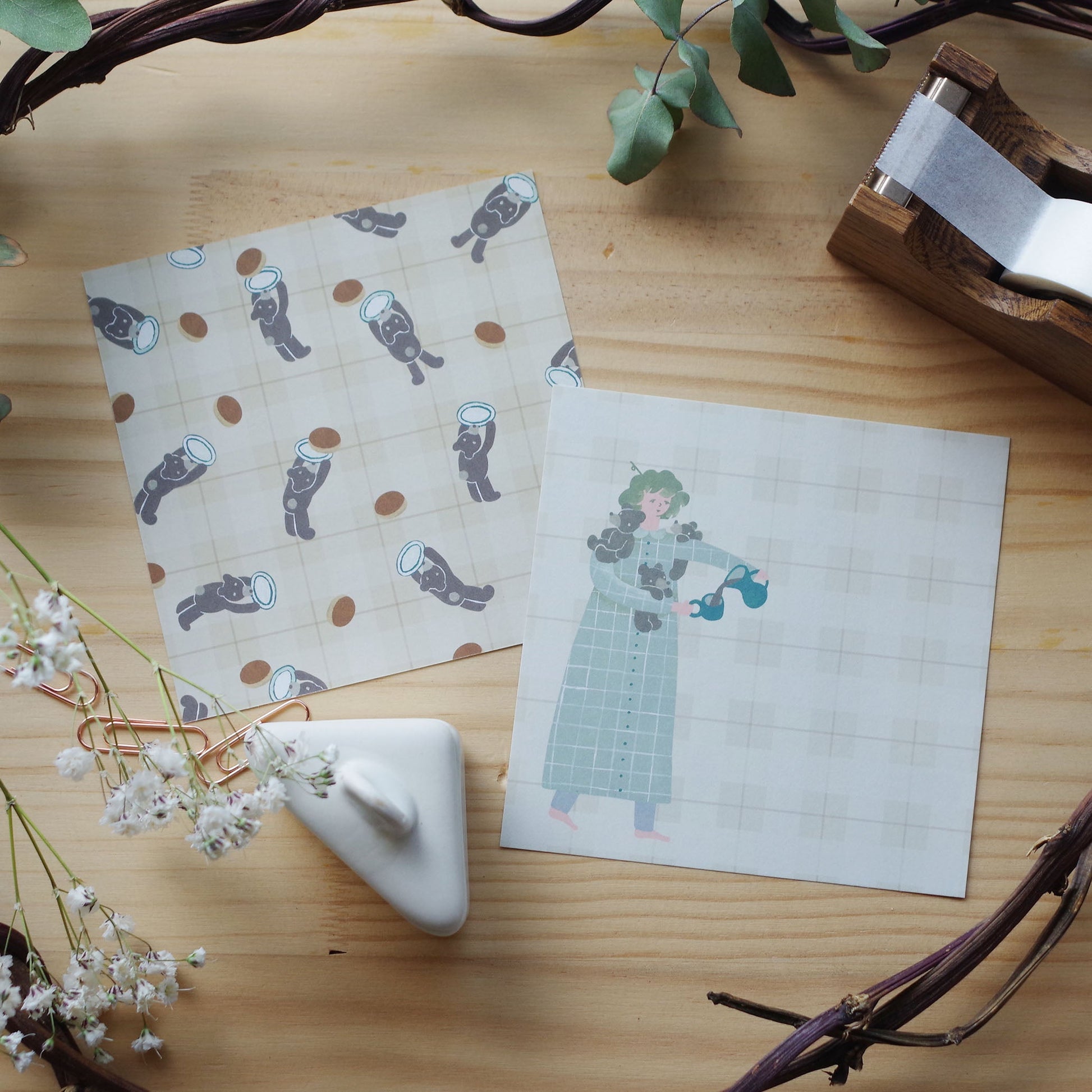 5種類のメモ用紙が10枚ずつ入った、50枚入りの正方形のメモ帳です。