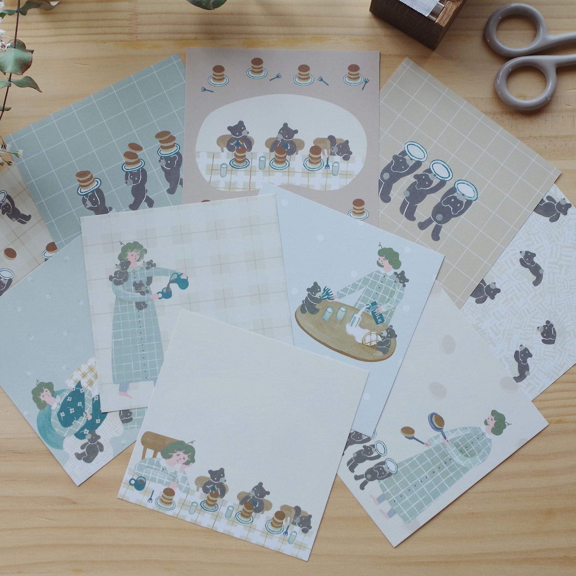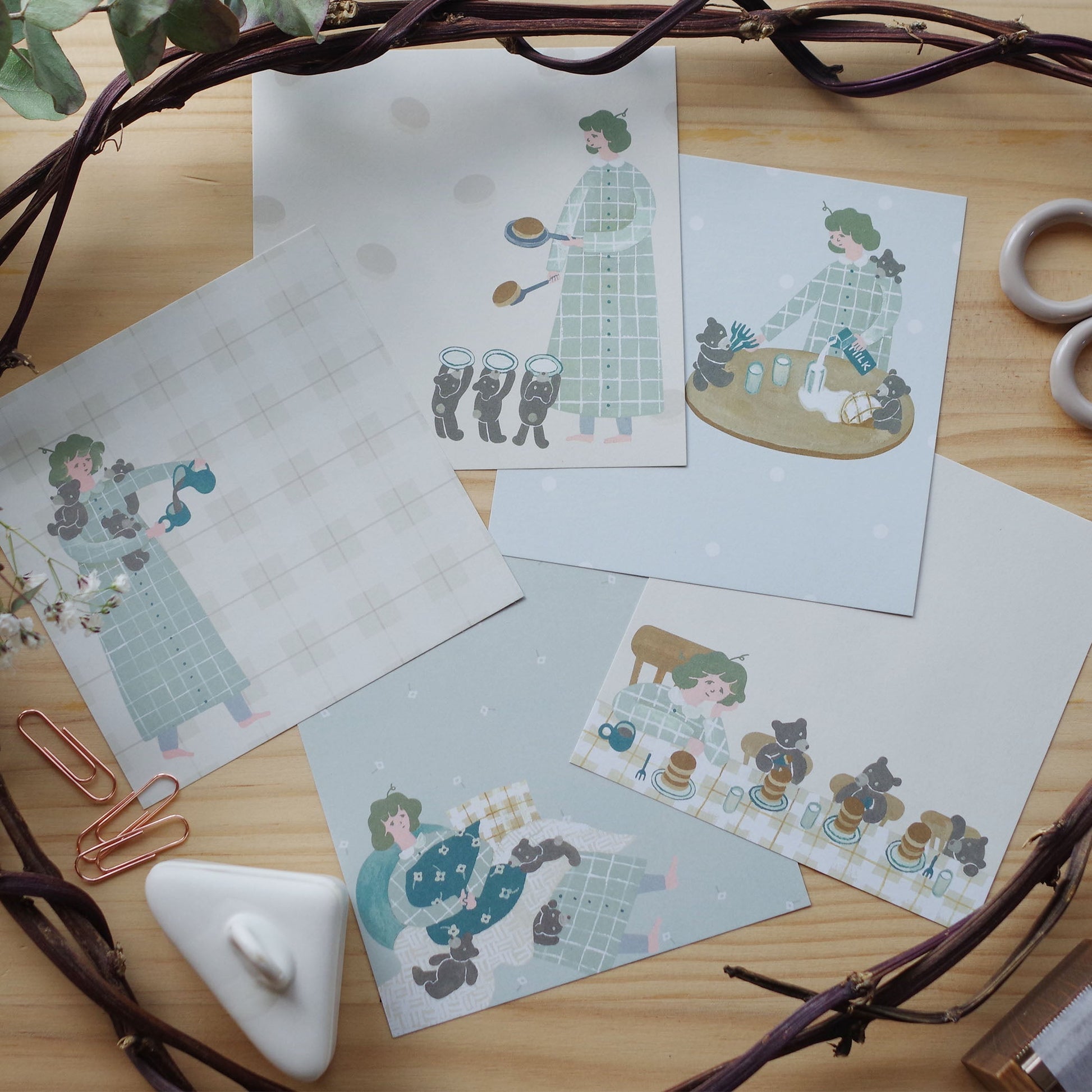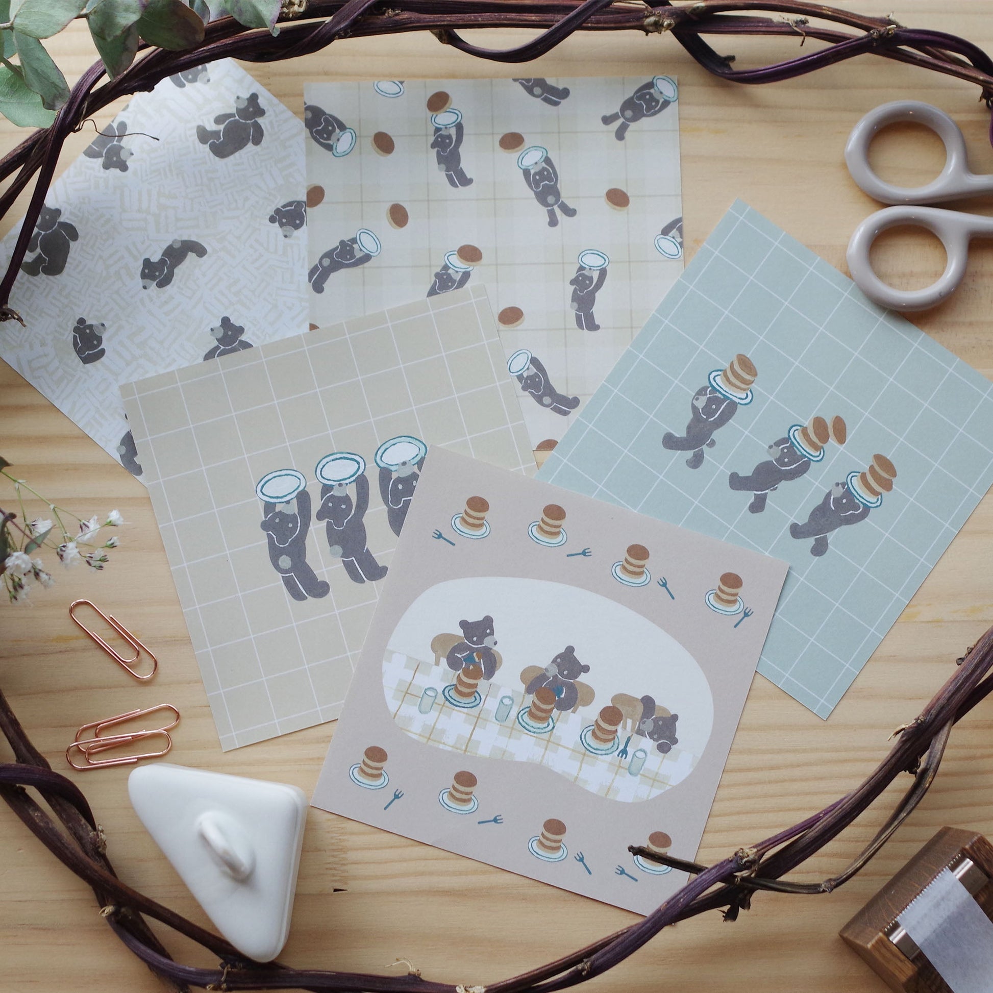 5種類のメモ用紙が10枚ずつ入った、50枚入りの正方形のメモ帳です。
