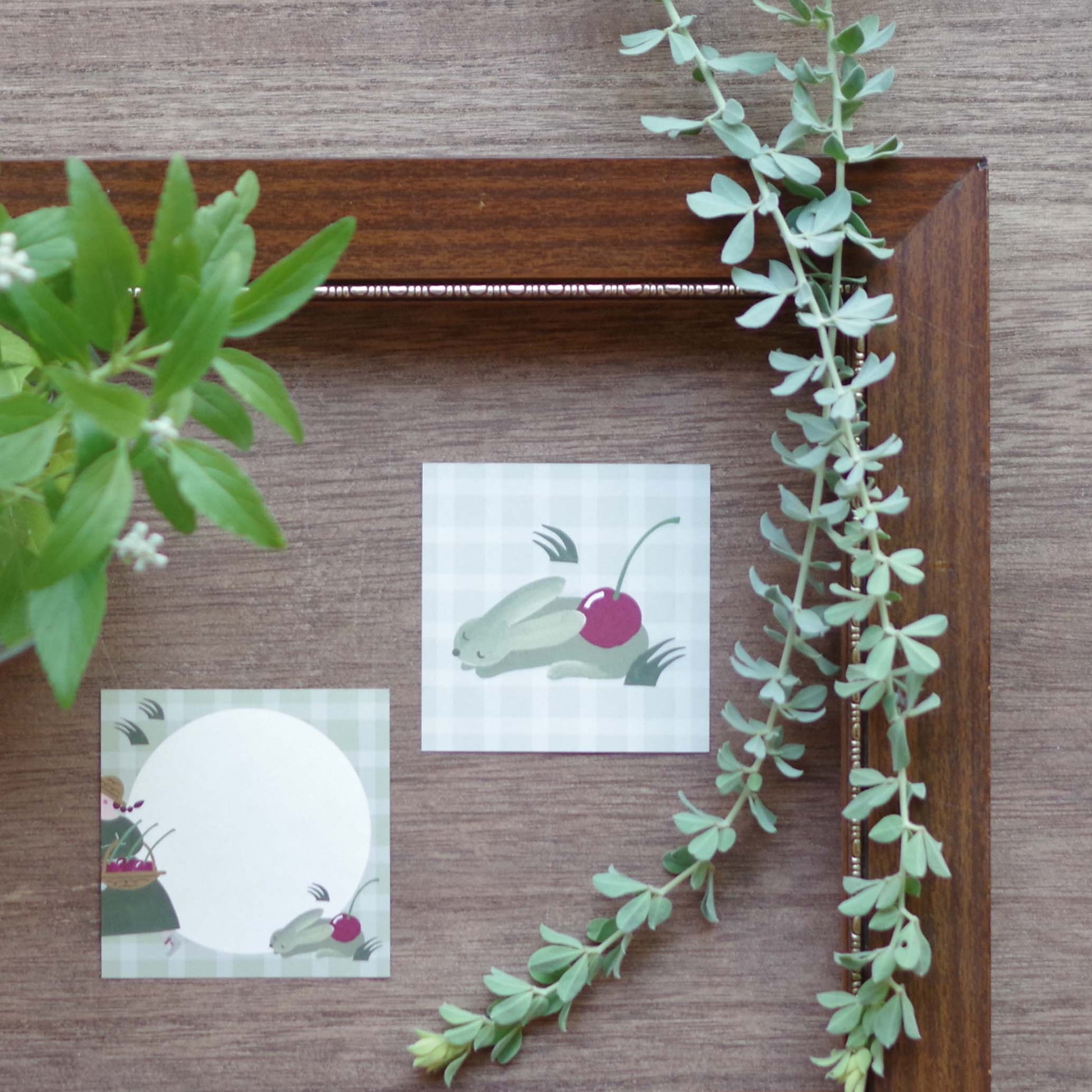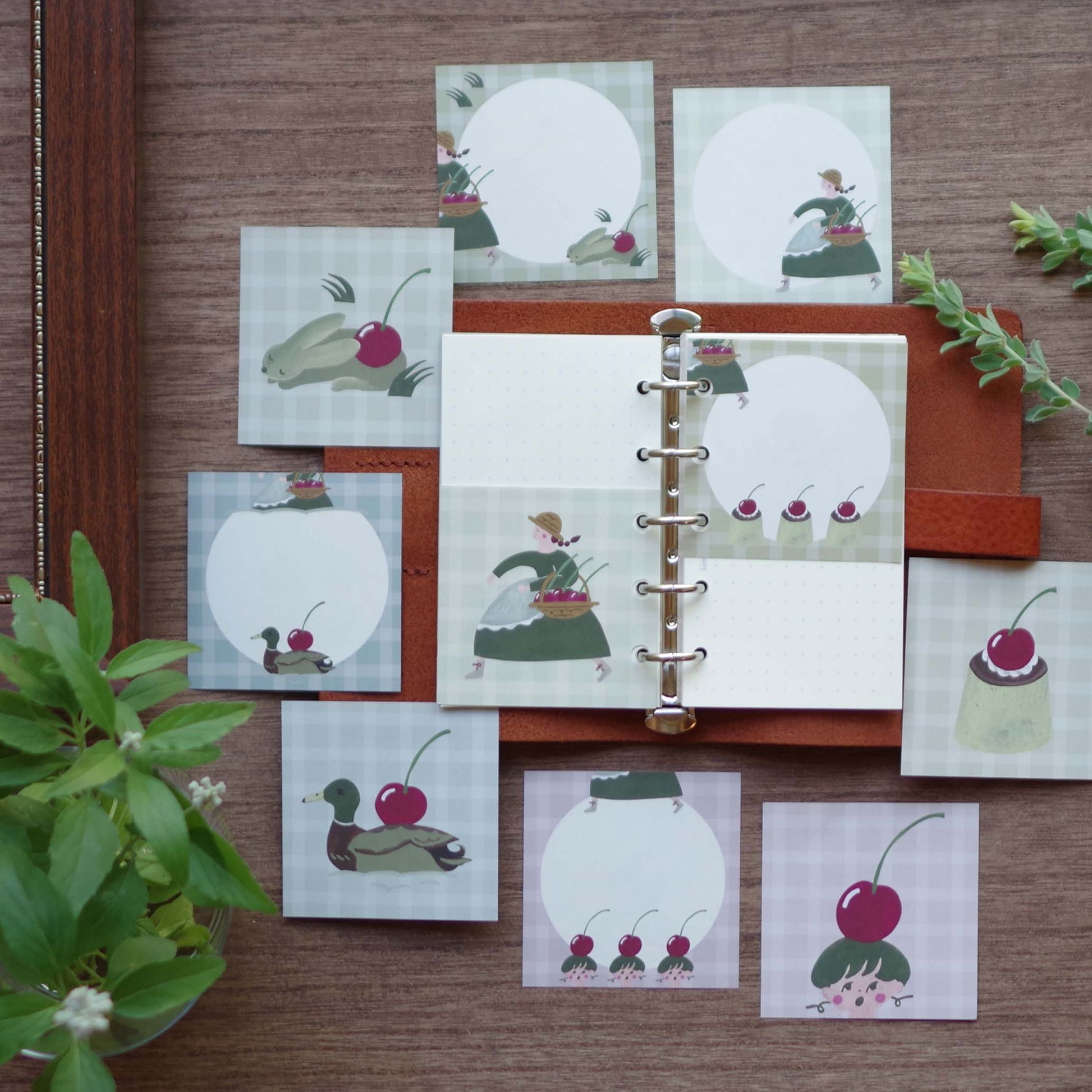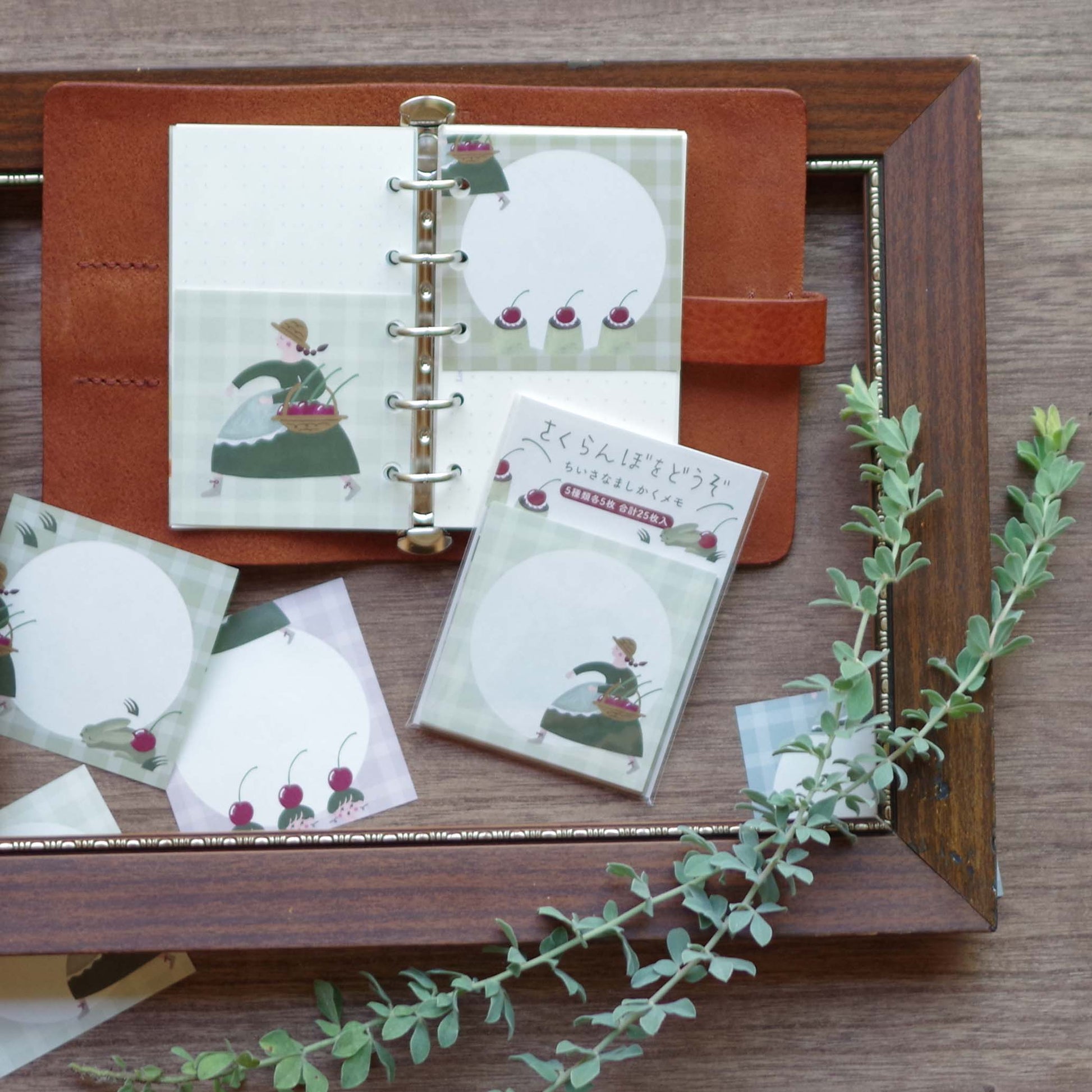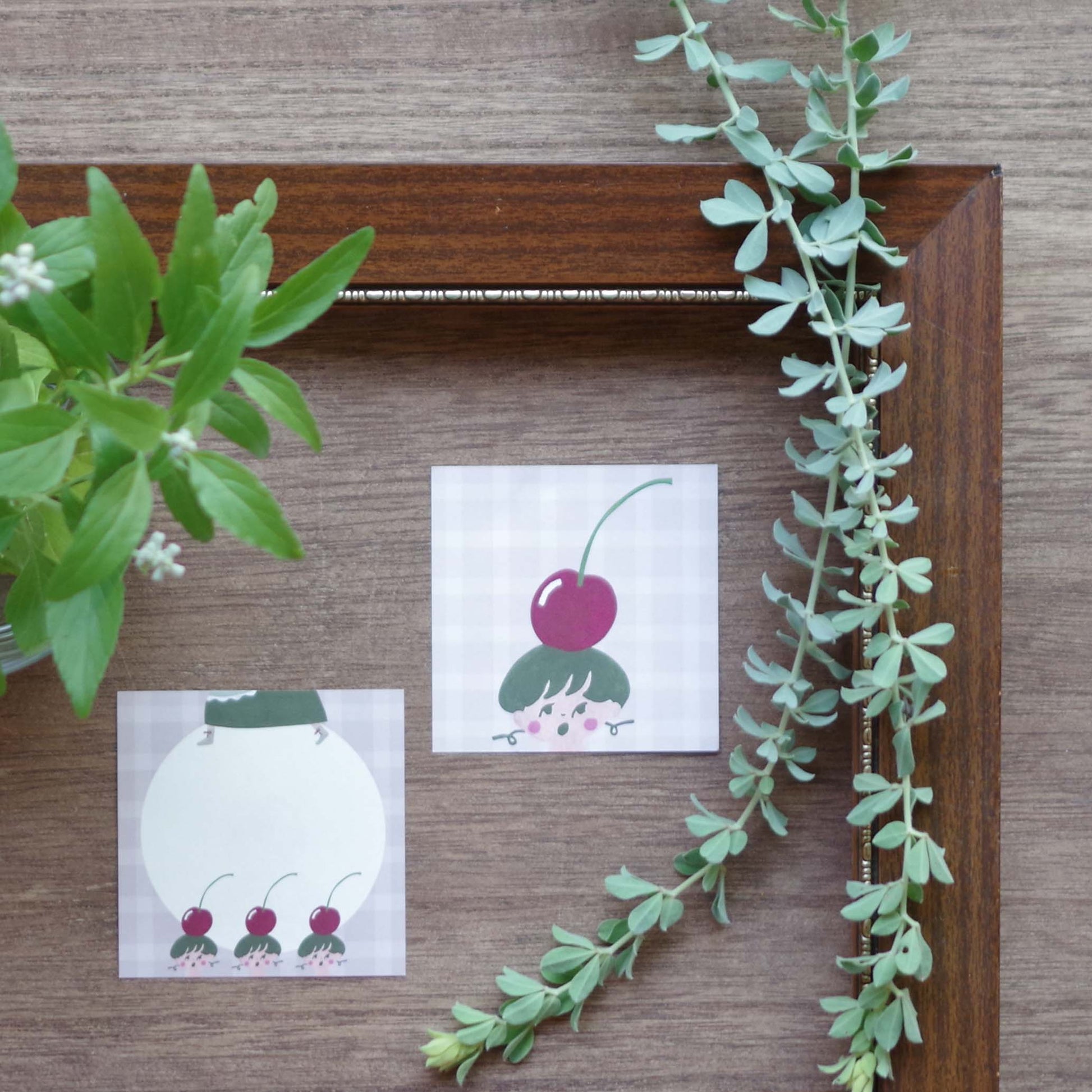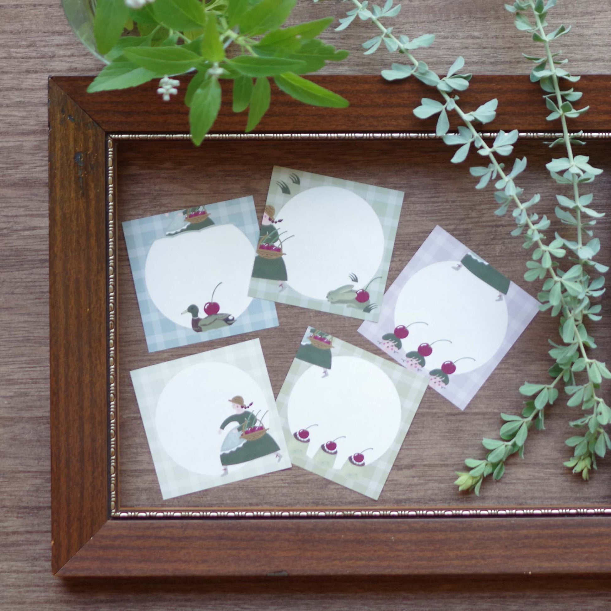 さくらんぼを配り歩く女の子の、ちいさな正方形のメモ帳です。