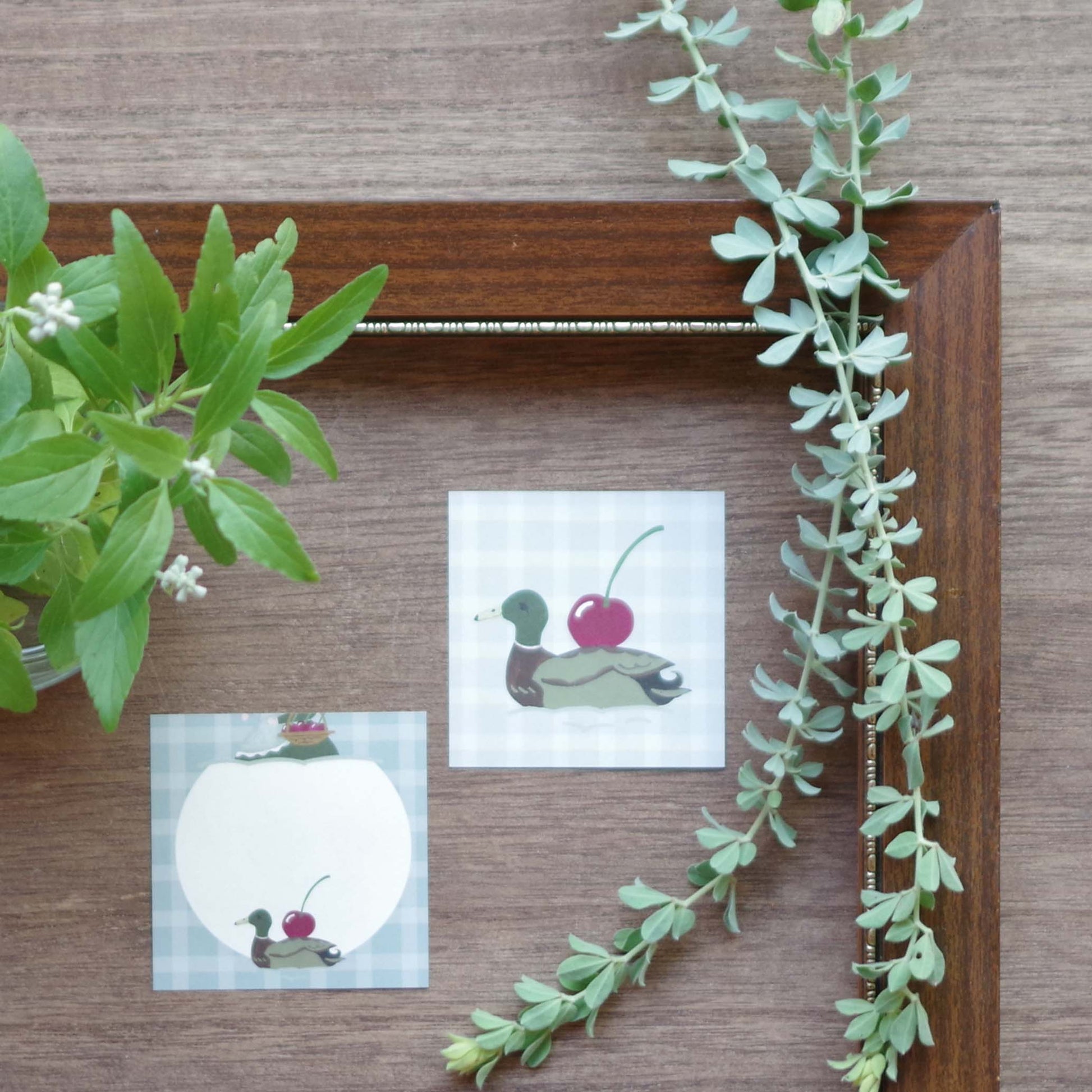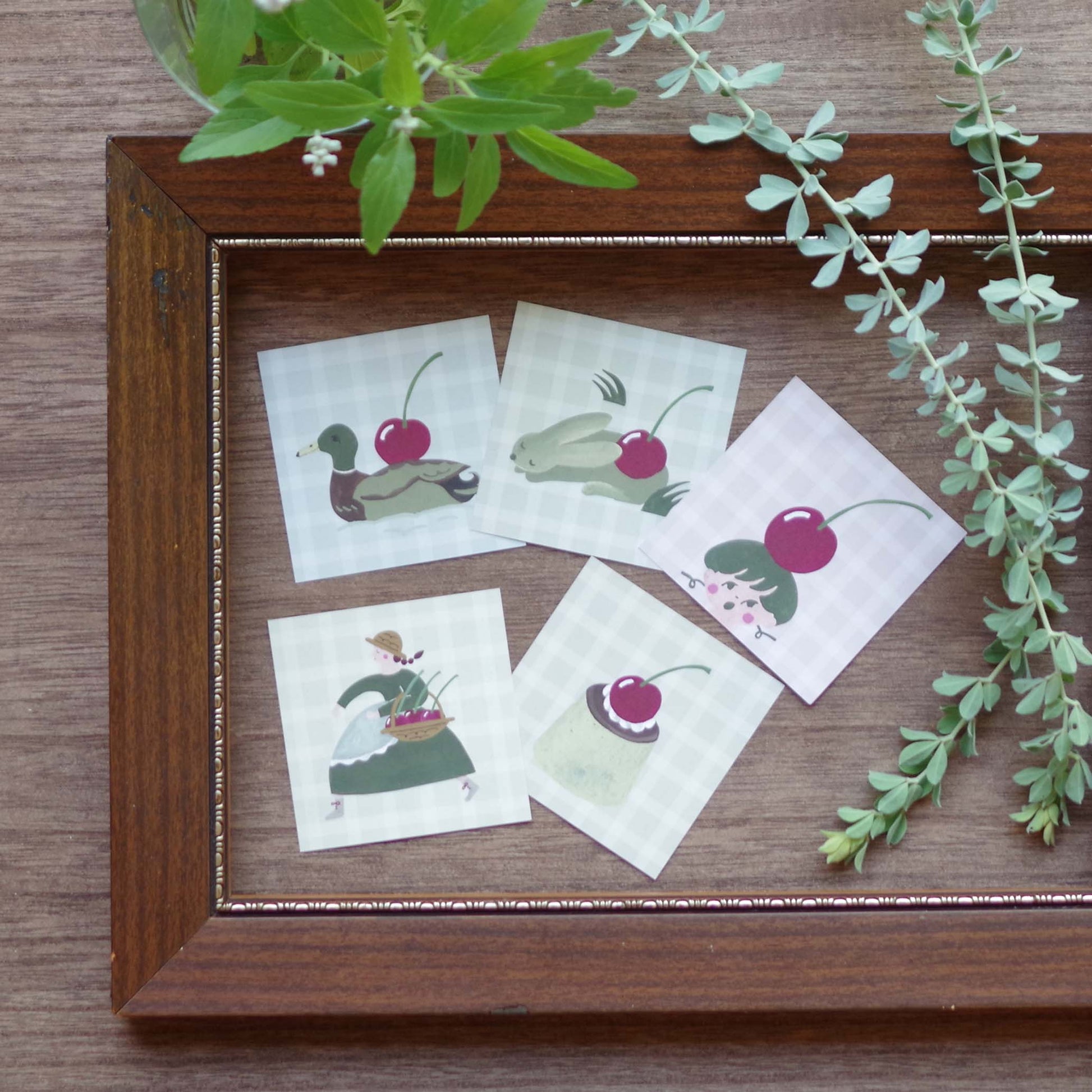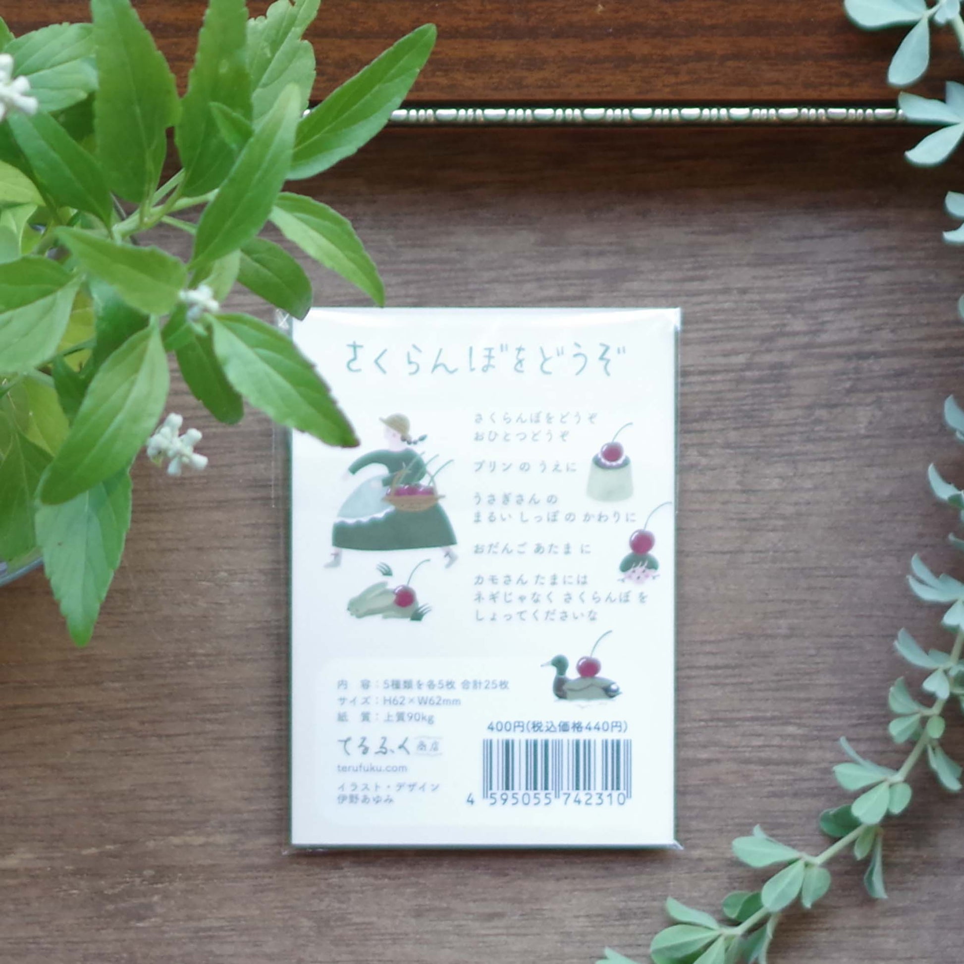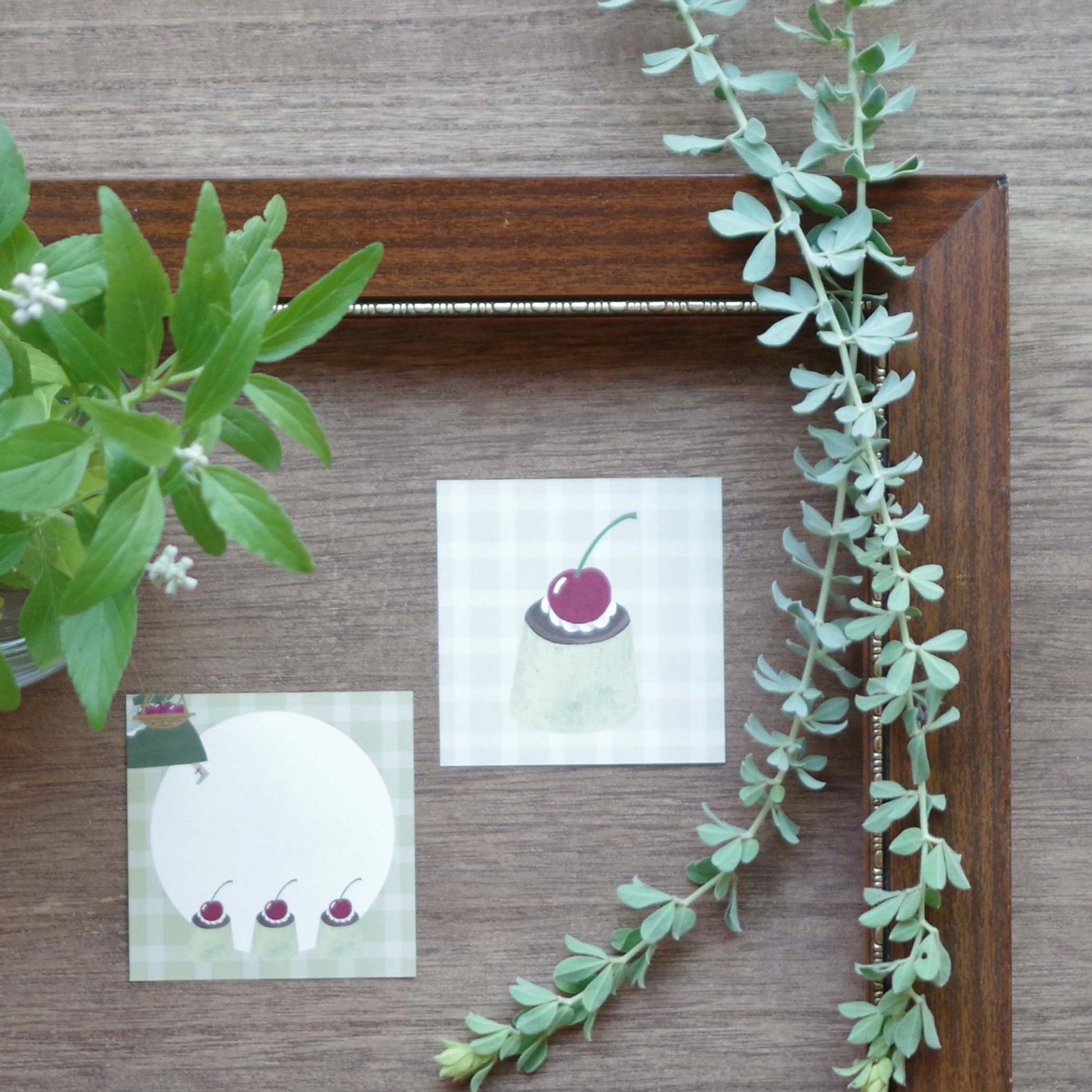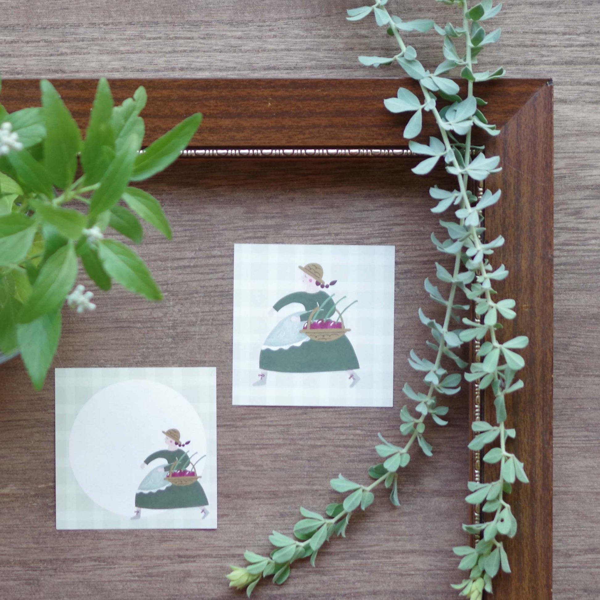 さくらんぼを配り歩く女の子の、ちいさな正方形のメモ帳です。